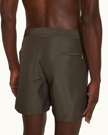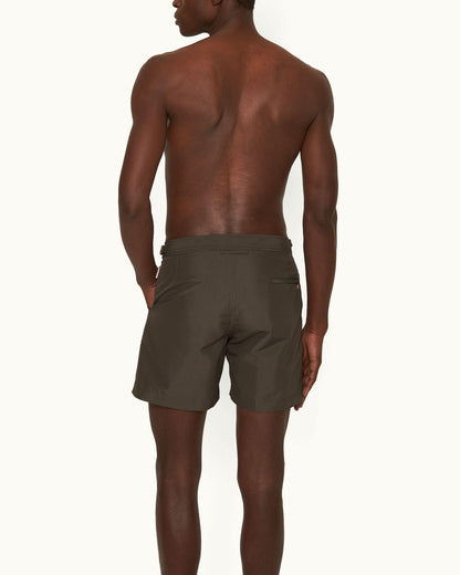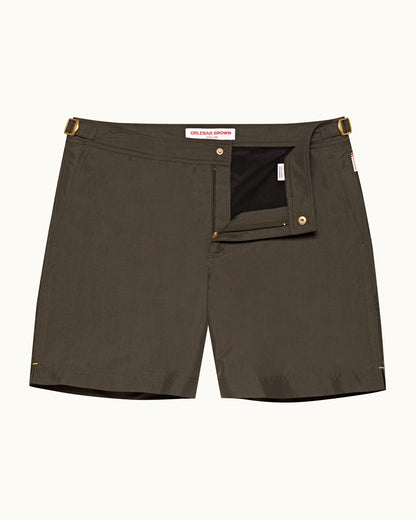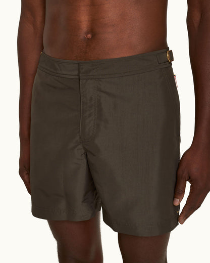 Diese dunklen Bulldog-Badeshorts sorgen am Strand für einen eleganten, modernen Look. Anstelle der klassischen Seitenschnallen haben wir uns bei diesem Modell für einen Strickkordelzug entschieden, um einen eleganten Look zu kreieren. Das luxuriöse, in Italien hergestellte Nylonmaterial ist schnelltrocknend und leicht und besticht mit einem attraktiven glänzenden Finish.