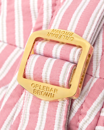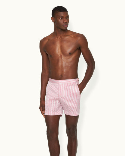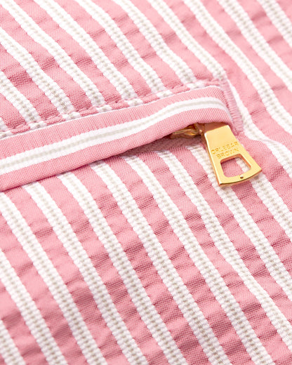 Ein stilvolles Update für jede Garderobe! Diese unverkennbaren Bulldogs sorgen für Urlaubsstimmung. Diese mittellangen Badeshorts überzeugen mit eingearbeiteten texturierten Streifen in Weiß und Hellpink und sehen einfach großartige aus. Wir haben das Modell mit einem eleganten Druckknopfverschluss und verstellbaren Seitenschnallen mit Goldeffekt versehen.