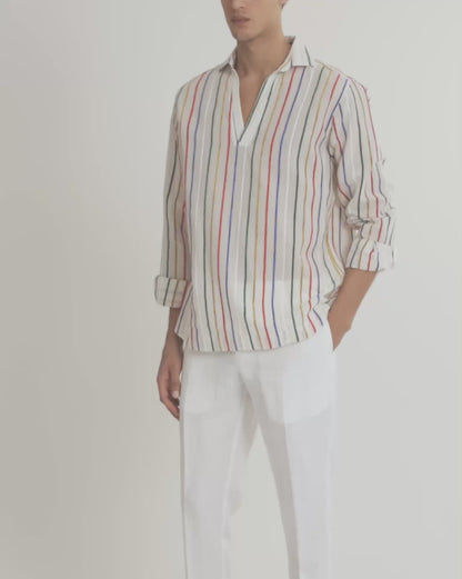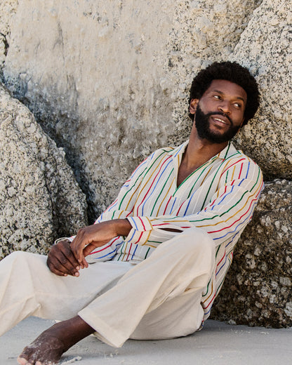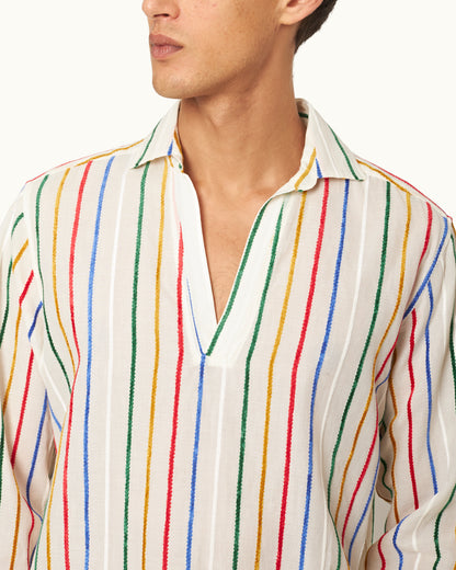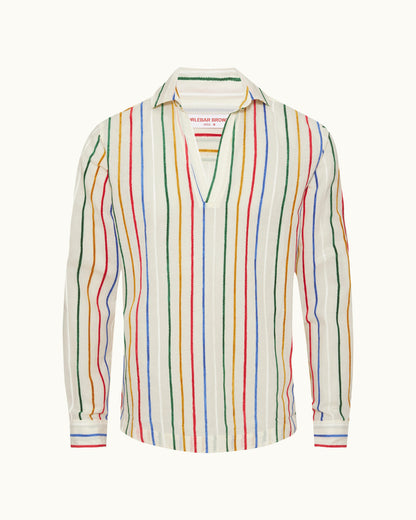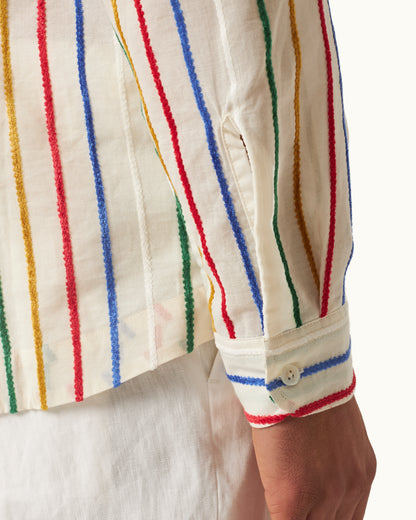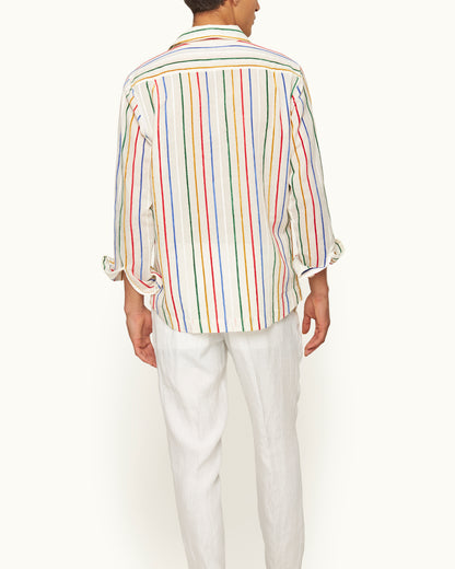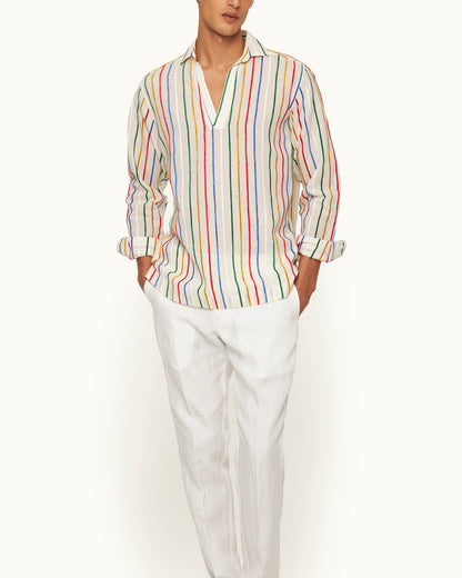 Dieses verspielte Ridley Shirt greift die kreative Energie der Kunstszene der 1970er auf – Pop Art im Sonnenschein. Es verfügt über vertikale Chenille-Streifen in einem dynamischen mehrfarbigen Design und wird für eine großartige Textur und herausragende Qualität aus einem in Italien hergestellten Leinenmaterial gefertigt. Die offene Resort-Kragenleiste und das lässige Design zum Überziehen vervollständigen den entspannten Look.