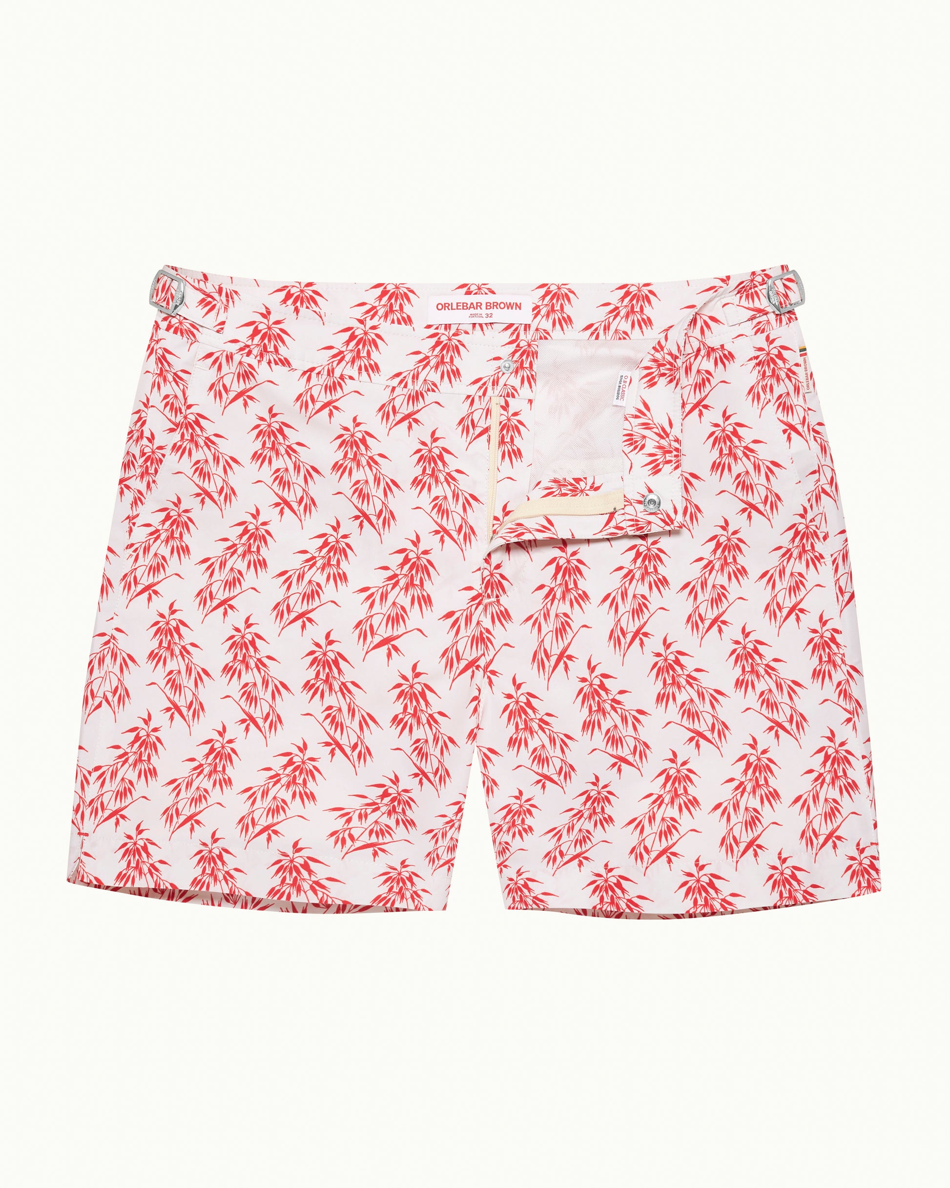 Embrace elegant summer styling with our Bulldog Bamboo swim shorts. The repeated Summer Red bamboo print dances across a background of White Sand, our signature colour palette. The light, quick-drying fabric keeps you dry and comfortable in between dips in the pool. This mid-length style is finished with classic adjustable side fasteners for the best fit.