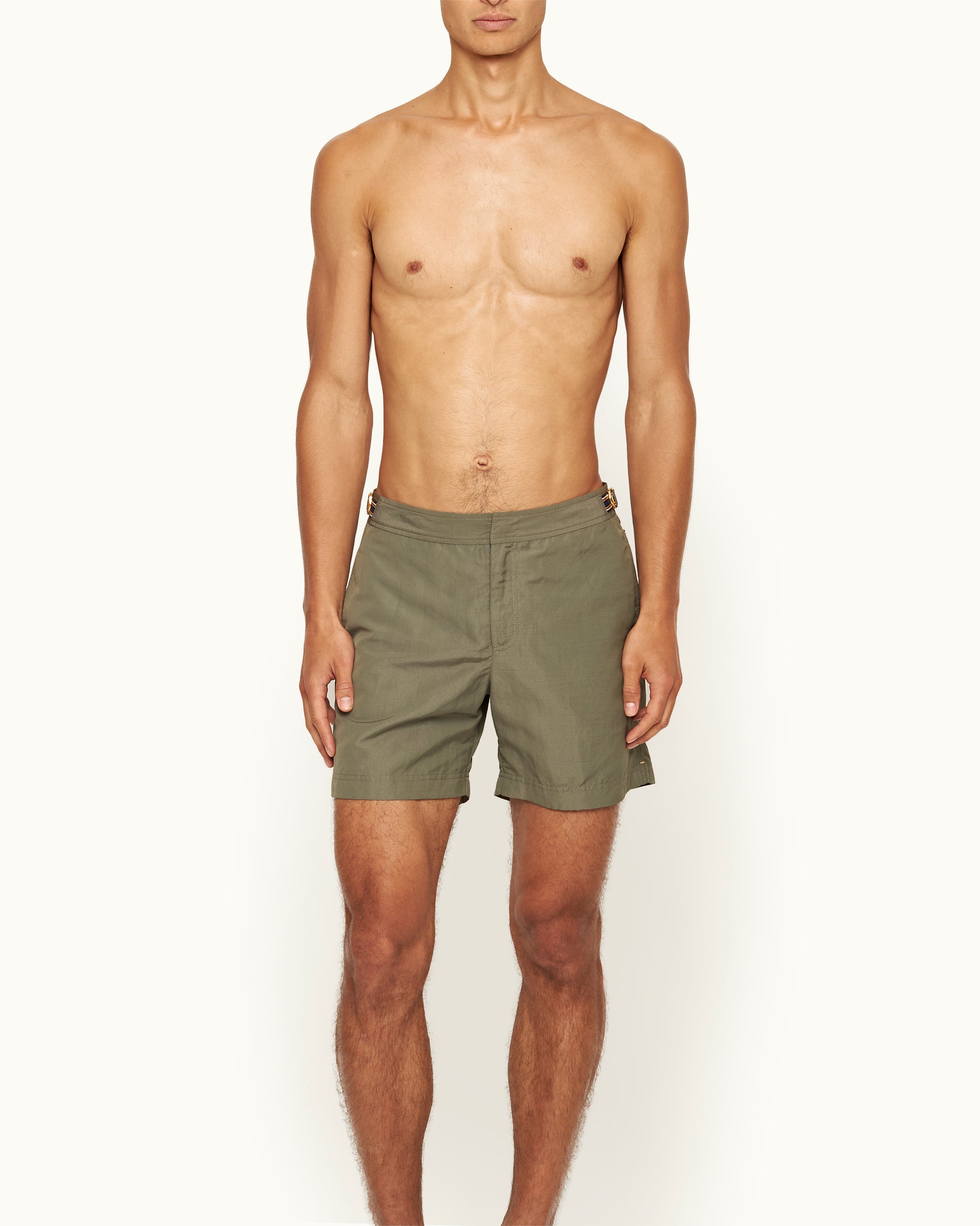 These stylish khaki Bulldogs are made from innovative mixed linen cleverly enhanced for the pool. In addition to recycled polyester, we've added a percentage of linen, resulting in a lightweight, quick-drying fabric. Adjustable gold-tone side fasteners and stripe grosgrain tape give these men's swim shorts a creative finishing touch.