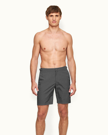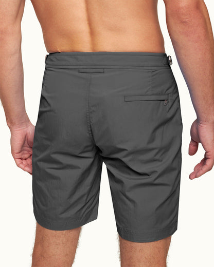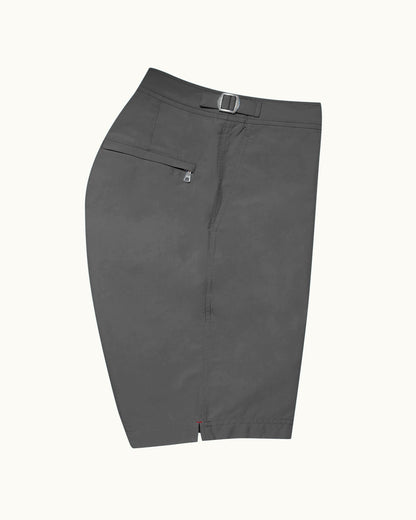 The OB Classic Dane II in Storm Grey is based on the pattern of a traditional man’s suit trouser – it's not a swim short, but a short you can swim in. The longer length swim shorts have a perfect fit and signature side-fasteners. With over sixty elements in each pair, OB Classic swim shorts are made from 100% recycled plastic."