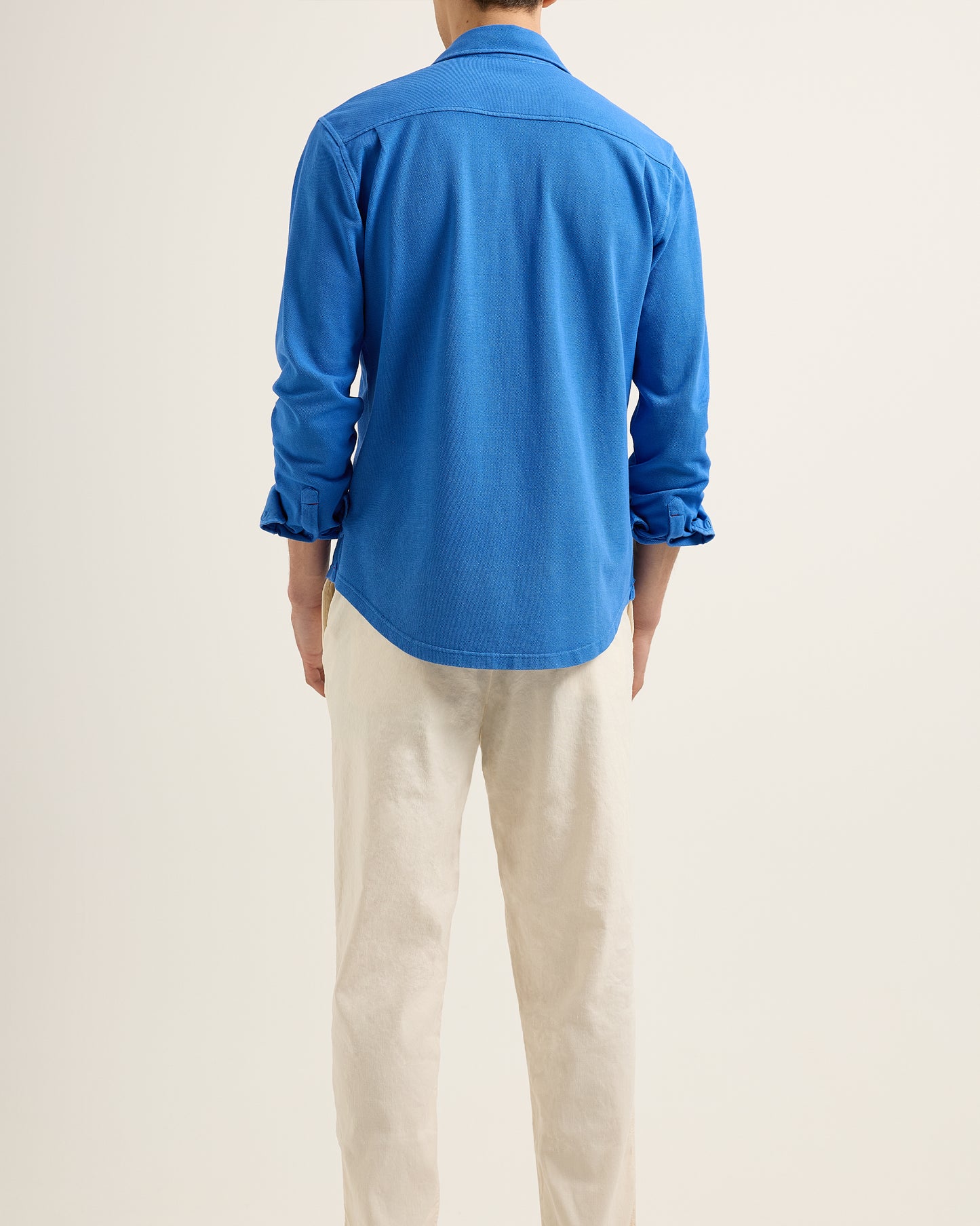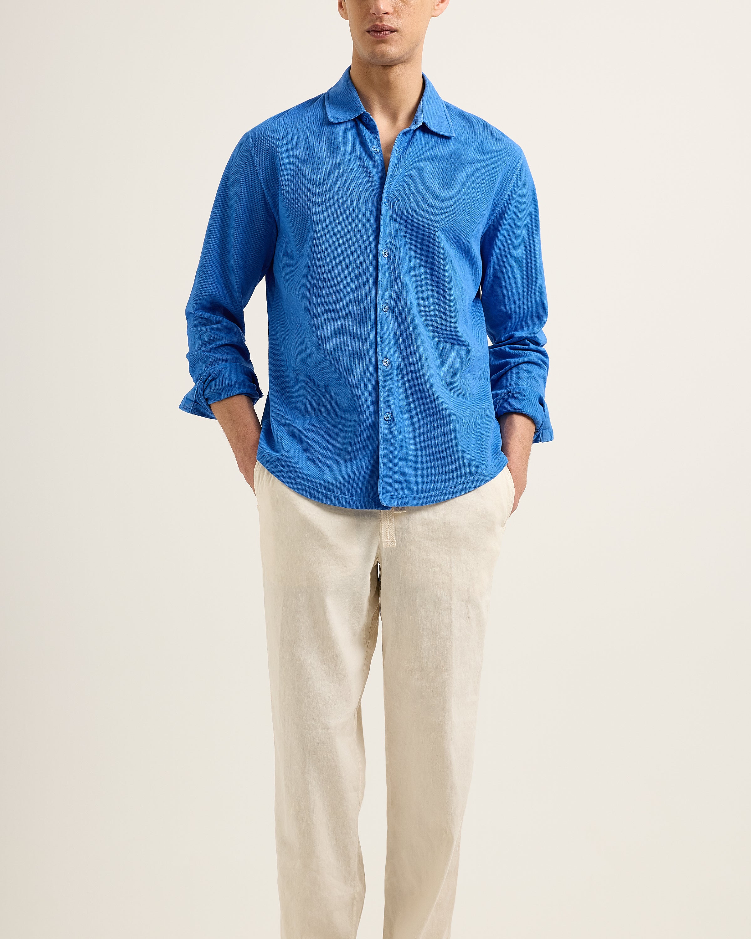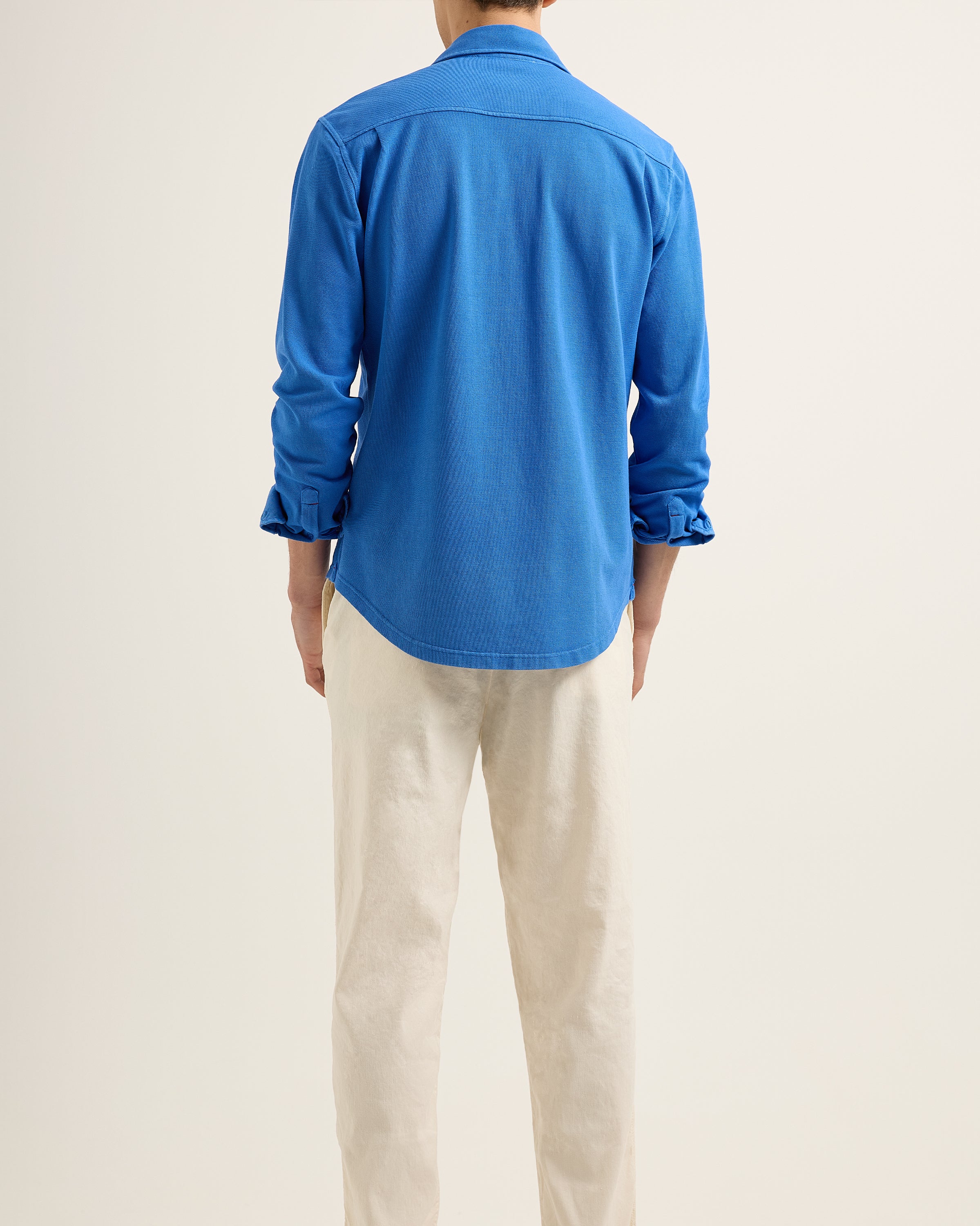 The horizon stretches, endless and unbroken. The engine hums low beneath you, steady, deliberate. The early mist burns away as the first slant of sun catches the spray, the sea shifting from silver to deep blue. You glance back – long black shores already a distant memory, the land dissolving into nothing. What’s ahead? It doesn’t matter. Only forward. The Giles Pique moves the same way - Italian-woven piqué, crisp but unforced, the garment-dyed finish carrying the quiet confidence of something well-worn, well-travelled. Tailored, but never stiff. A shirt for a man who knows when to let go of the map.