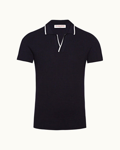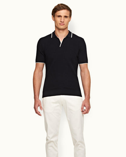 Knitted from 12-gauge organic mercerised cotton, this is craftsmanship you can feel — soft with a quiet lustre, like moonlight on polished wood. The pique stitch gives it that classic texture — breathable, tactile, substantial — while the open resort placket brings a whisper of the Amalfi to wherever you happen to be standing.