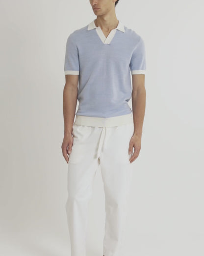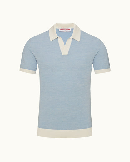 Our Horton polo shirt is all about bold lines and luxury textures. The cotton and merino Italian yarn twist together to create a soft and textured feel, while the white ribbed detailing accentuates the pale blue base. And with our trusted tailored fit and fully fashioned seams, you can enjoy a comfortable natural fit.