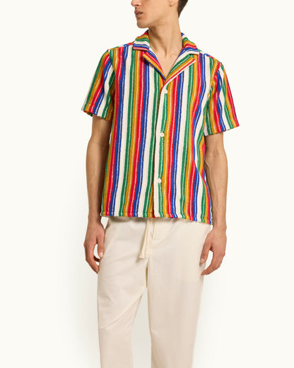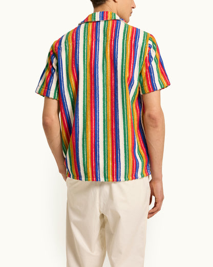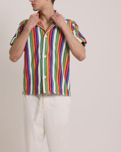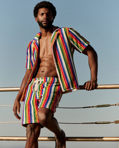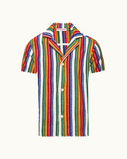 Art and lounging come together to create this striped Howell shirt. In bold primary colours, the vertical jacquard stripes pop out from the design with artistic panache. However, in soft cotton towelling with a relaxed fit, comfort isn’t just an afterthought; it’s guaranteed. The addition of scalloped edges along the hem and cuff adds an unexpected twist.