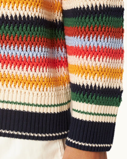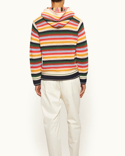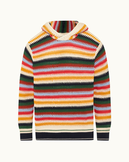 Make a style statement with your loungewear. Our Kirk cotton jumper plays with colour and texture for bold, impactful results. The creative crochet stitch forms cascading multicoloured stripes, from the double-layered hood down to the ribbed hem. Reach for our Kirk hoodie when your outfit needs a colourful, comfortable boost!
