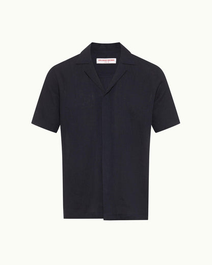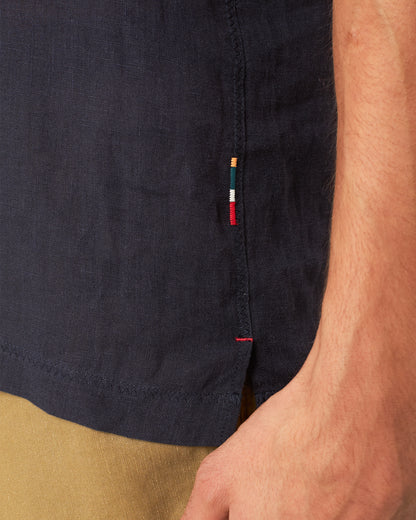 Our Night Iris Maitan shirt boasts Italian-woven linen to form a lightweight feel and carefree, vintage look. It also features a retro-inspired Capri collar, split hem, and a concealed button placket to underscore the clean lines of the shirt's silhouette. On the split hem, you'll find our subtle O.B stripe embroidery — our colourful signature touch.