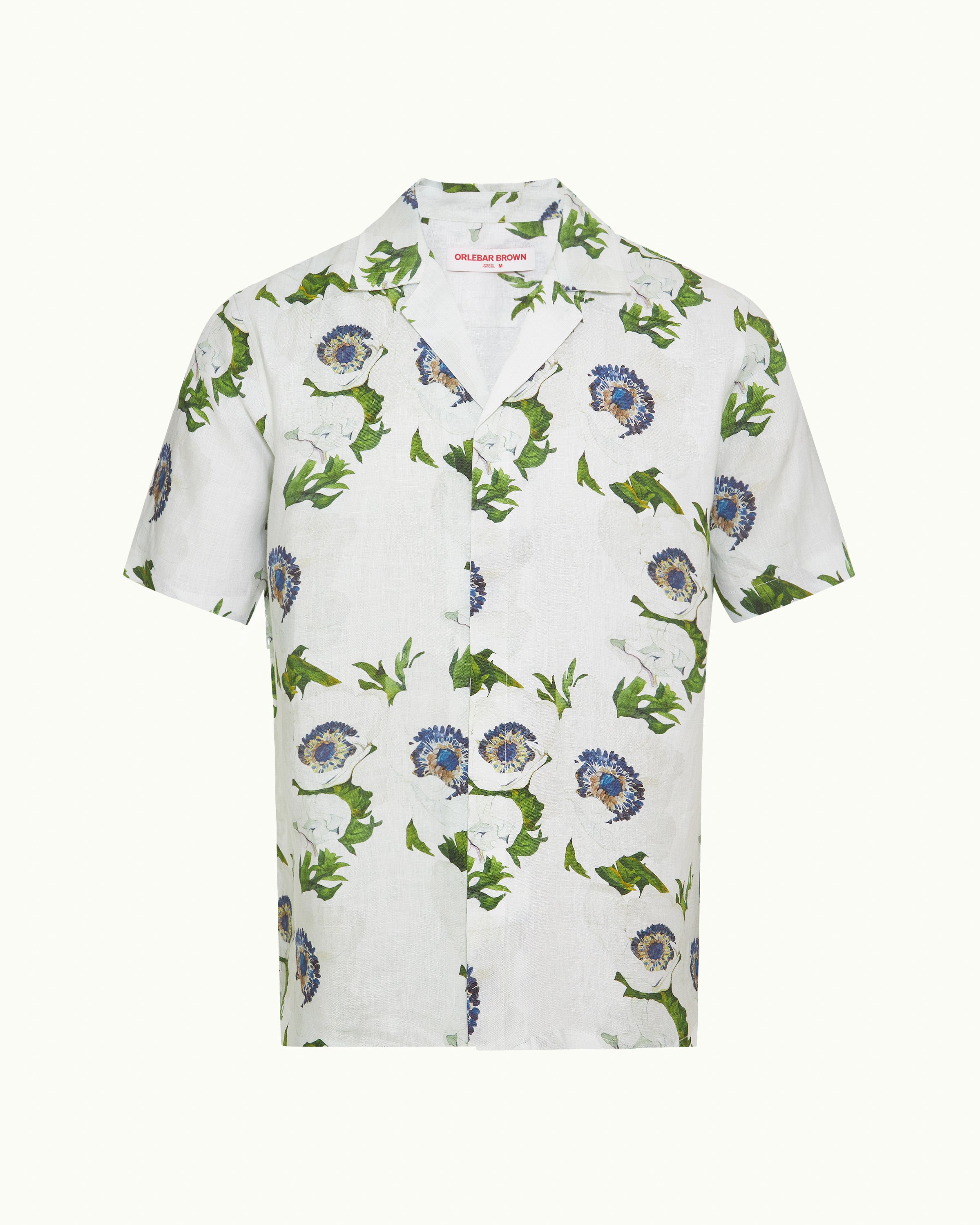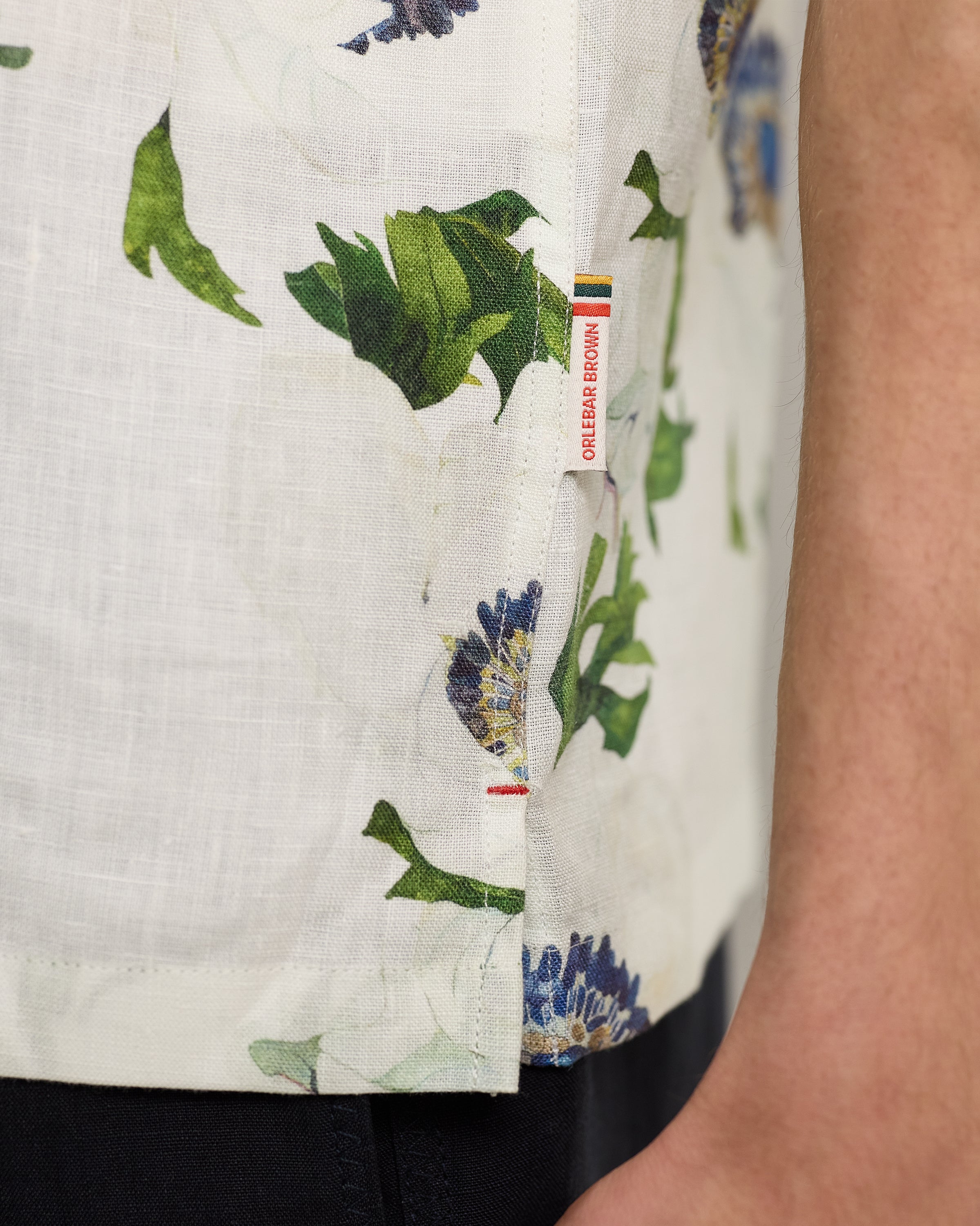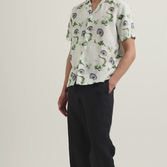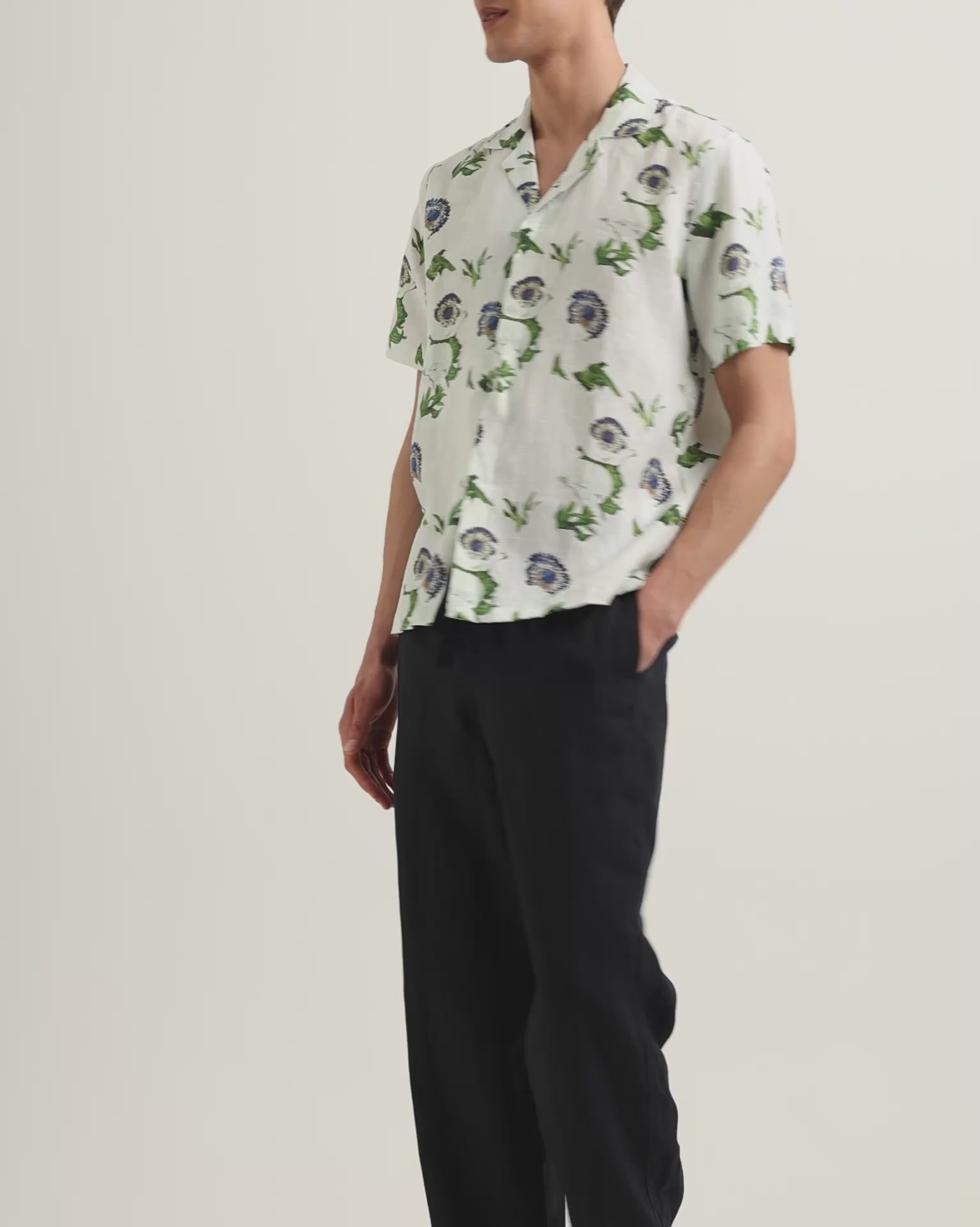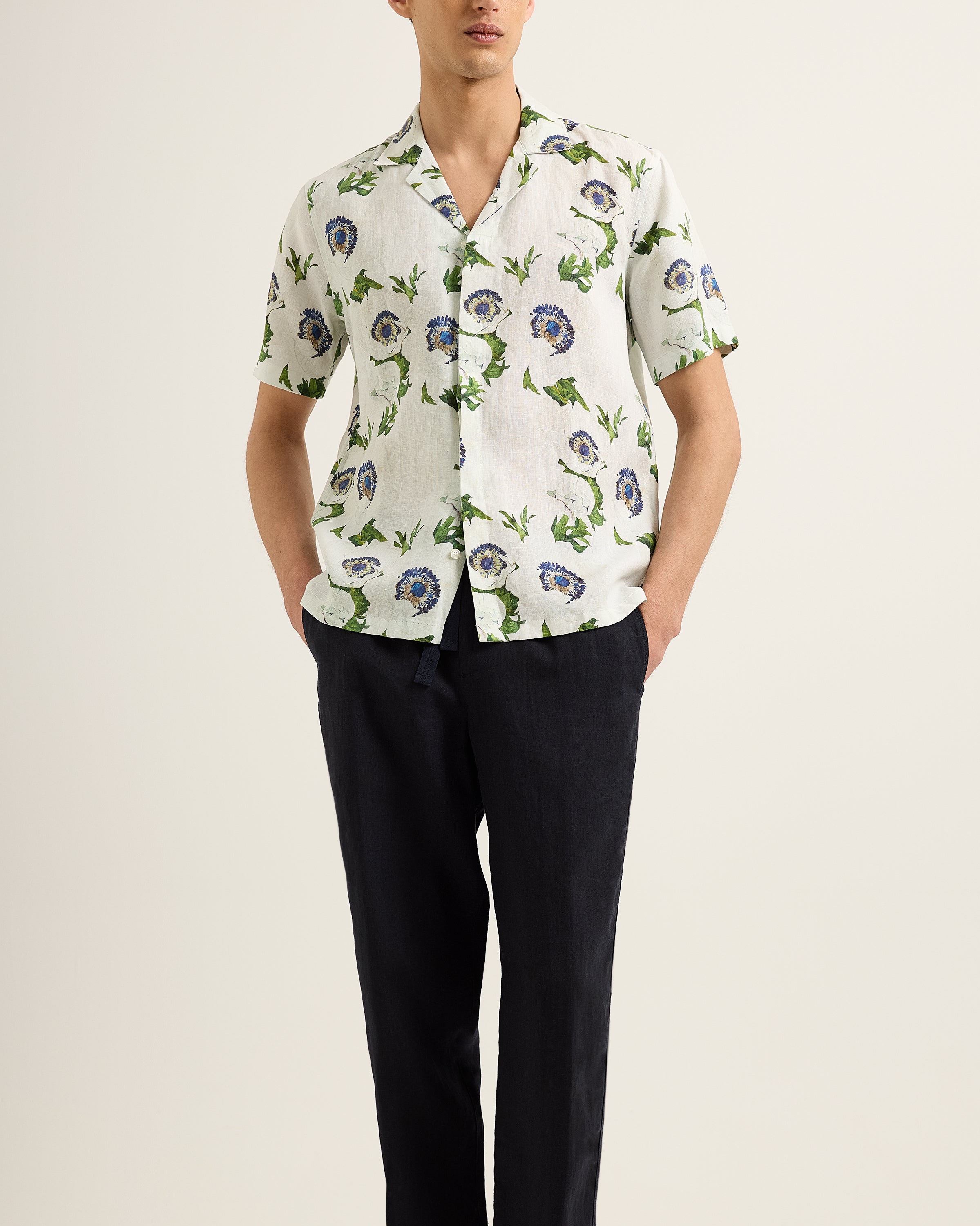 The Maitan moves with effortless ease - lightweight, woven with the bold sweep of the Coronaria print, a hint of playfulness beneath clean precision. The Capri collar rests just open enough, the concealed placket keeping its refinement intact. A shirt made for slipping between worlds, for moments that feel like déjà vu.