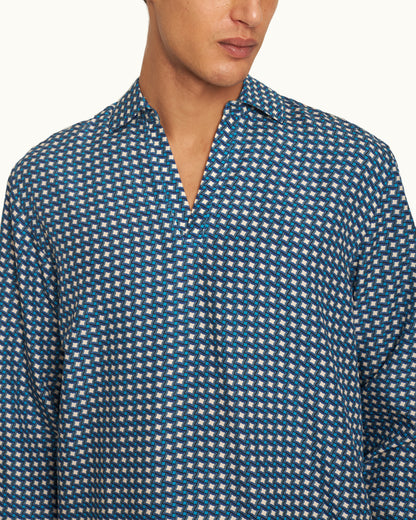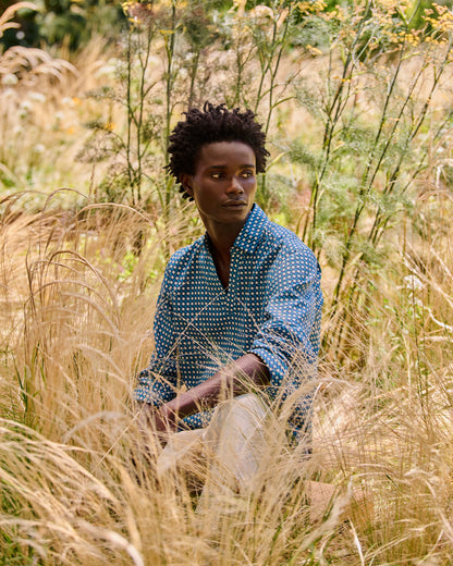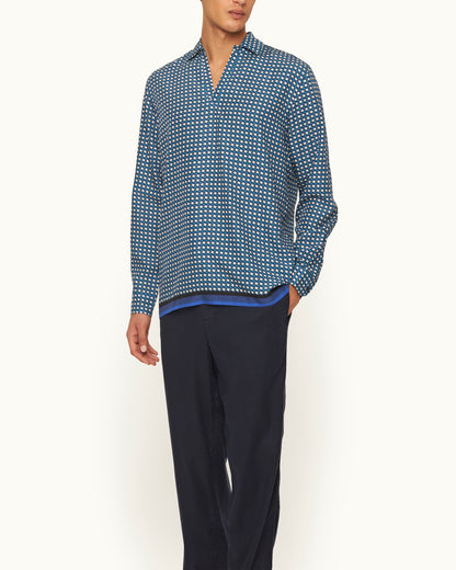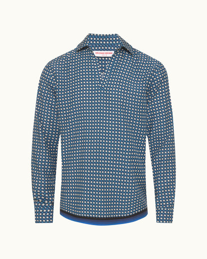This overhead shirt blends our expressive Piscina print with the relaxed tailoring of our trusted Ridley. This exclusive print takes inspiration from swimming pool tiles, creatively underscored by gradient stripes along the hem, all in tempting shades of blue. This long-sleeved holiday shirt is laidback in all other ways, from the relaxed fit to the open resort placket.