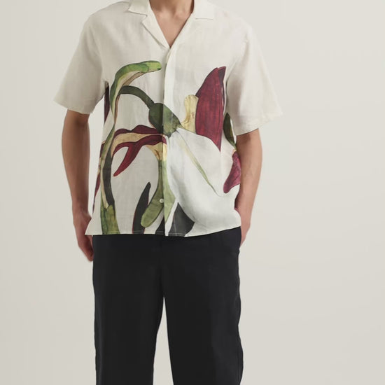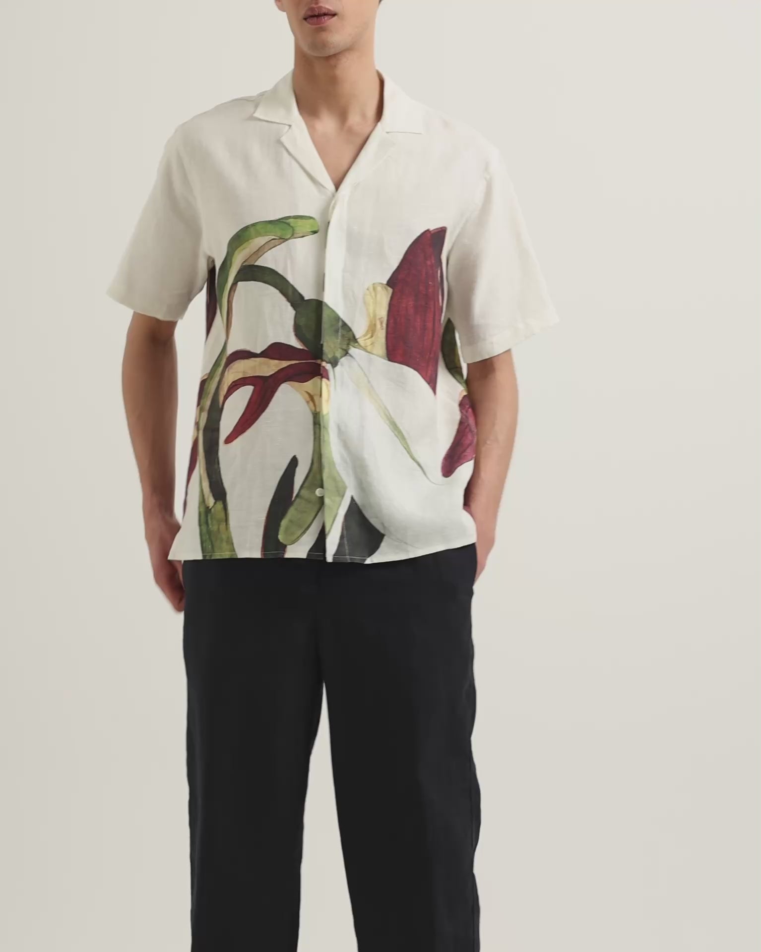 The Maitan moves with effortless ease - lightweight, woven with the bold sweep of the Orchis print, a hint of playfulness beneath clean precision. The Capri collar rests just open enough, the concealed placket keeping its refinement intact. A shirt made for slipping between worlds, for moments that feel like déjà vu.