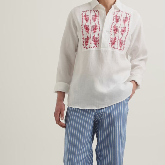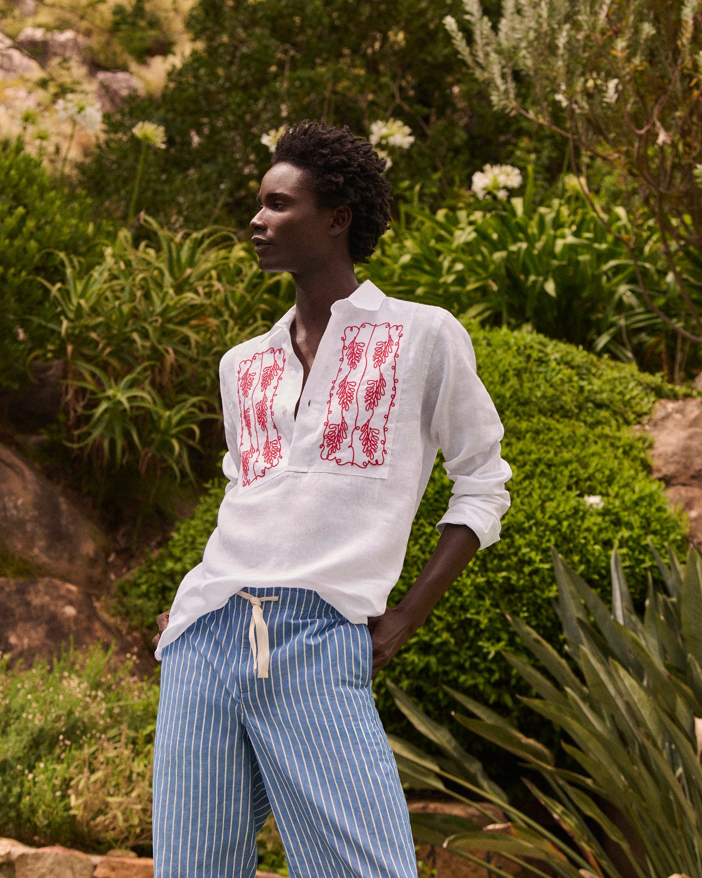 The Ridley belongs to moments like this - where confidence is quiet, and every detail matters. Embroidered chainstitch flows through Italian cotton, a pattern as intricate as the play unfolding across the board. The open placket, the relaxed drape fluttering faintly with the breeze that sweeps across the poolside. To his right a glass of summer delight - a Negroni radiant as a Roman sunset.
