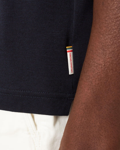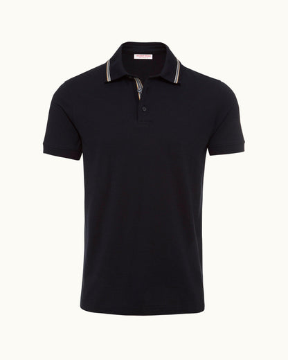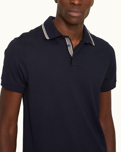 Our smart Dominic polo combines classic tailoring with a signature O.B touch — contrast seasonal stripe tipping along the collar and the inner placket. This navy short-sleeved polo shirt keeps it simple with a three-button placket, classic fit, and breathable jersey fabric to comfort you throughout the seasons.