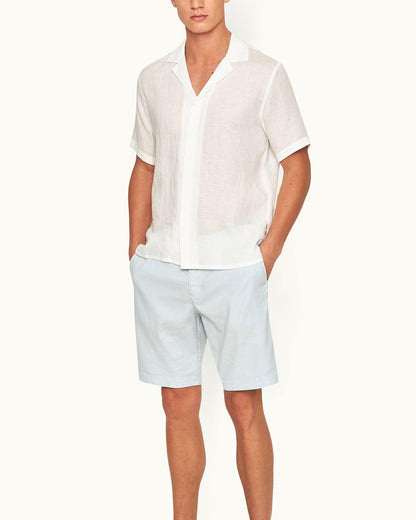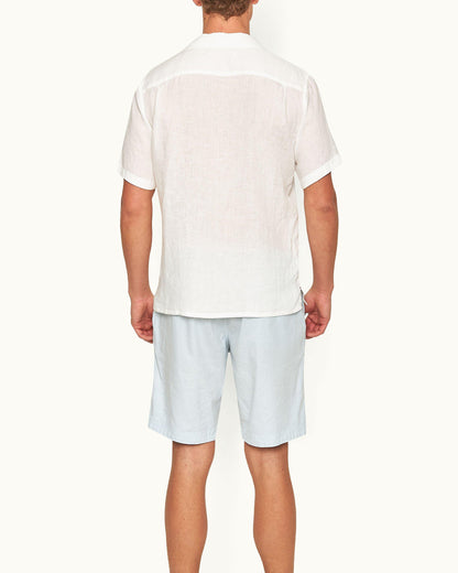 We created this white Maitan shirt using luxe Italian linen, resulting in a light, laidback feel whenever you button up. This easy holiday style has a retro-inspired Capri collar, split hem, and a concealed button placket to streamline the silhouette. On the split hem, you'll find our signature O.B. stripe, the perfect finishing touch.