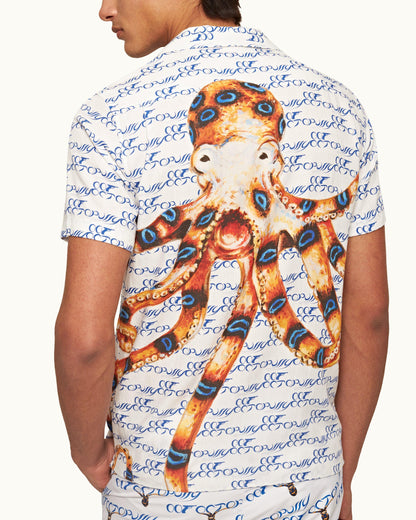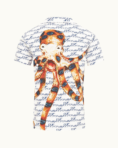This striking Capri collar shirt features a print of the iconic octopus and 007 artwork created by artist Maciek Piotrowski for Octopussy (1983). The artwork featured on the robe worn by Maud Adams, who played Octopussy herself in the film.