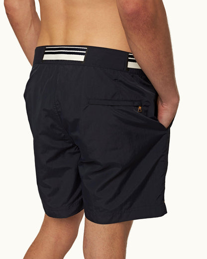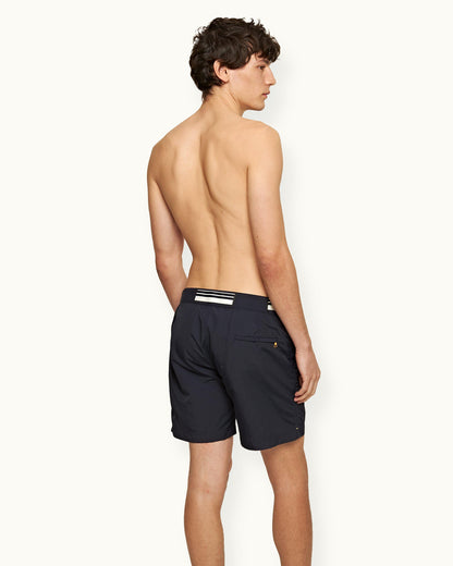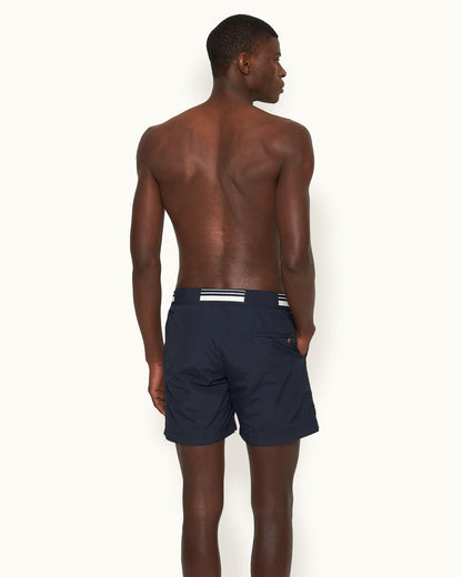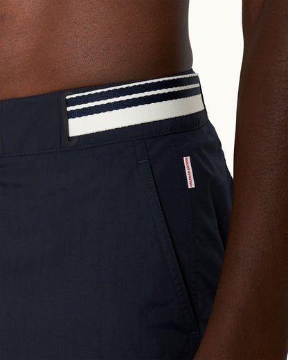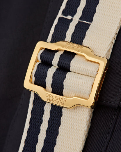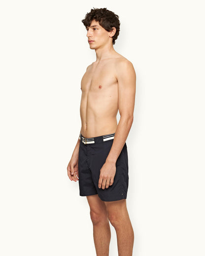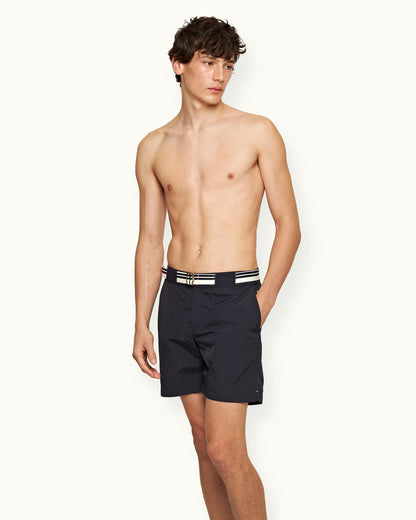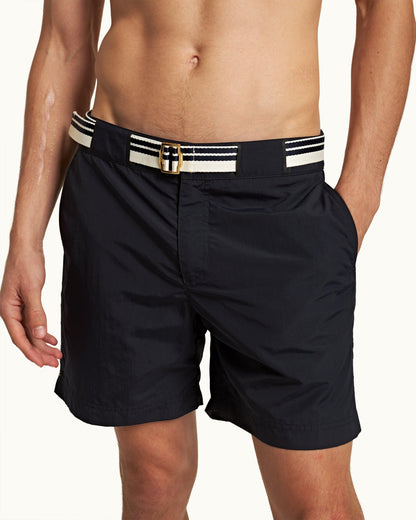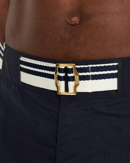 In place of signature side fasteners, we've elevated these Bulldog swim shorts with a tape belt in seasonal stripes. The gold-effect belt fastener adds a luxurious glow to this statement style.