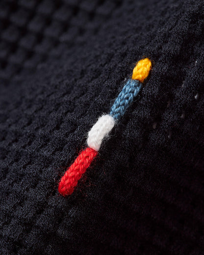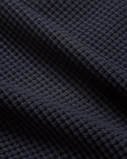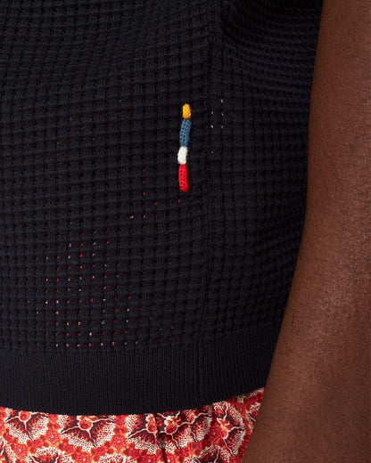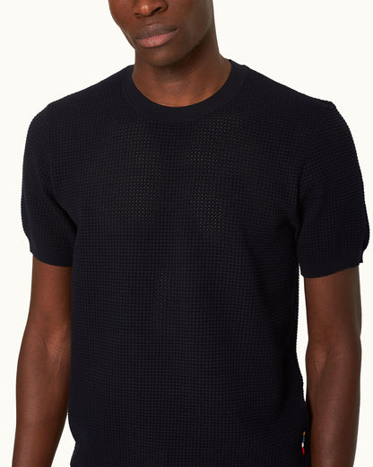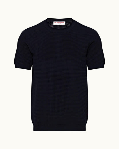 Elevate your tee selection with our knitted navy Byrtel T-shirt. The light 14-gauge Italian knit is ultra-breathable and resilient, while the waffle stitch detailing introduces texture. This short-sleeved T-shirt is finished with a flattering short, open resort placket in a seamless finish thanks to the fully fashioned ribbed knit.