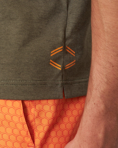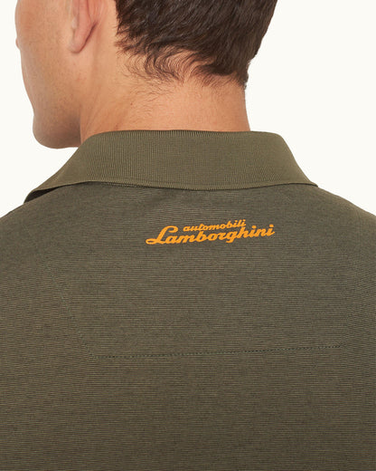 This Dominic polo shirt enjoys a bold reimagining in our collaboration with the iconic Automobili Lamborghini. The hexagonal embroidery on the hem takes direct inspiration from the stylistic element that has characterised Lamborghini design since the very beginning. The Arancio Apodis Orange logo and detail match the Revuelto model, while the Green Verde Turbine base also derives from the Lamborghini colour library. To make the colours pop, team this look with our Arancio Apodis Bulldog swim shorts.