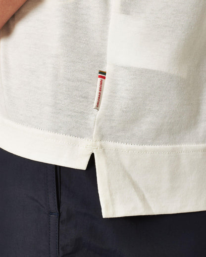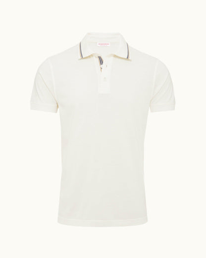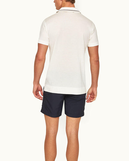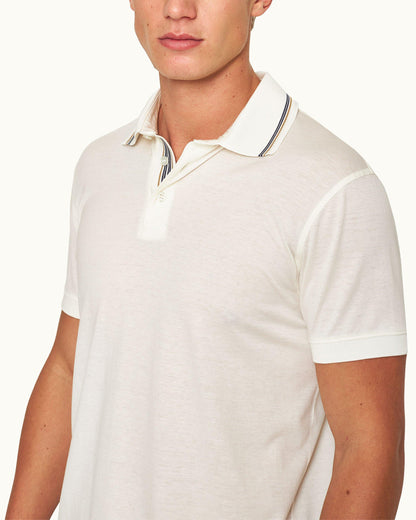 Our Dominic polo combines classic styling cues with a signature O.B twist — subtle seasonal stripe tipping along the collar and the inner placket. This short-sleeved white polo shirt keeps it simple with a classic fit, three-button placket, and airy jersey fabric to comfort you from season to season.