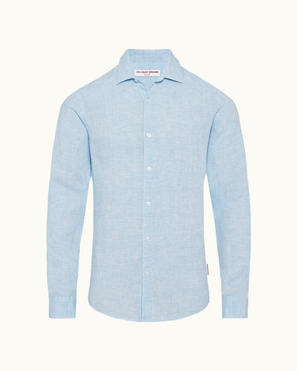 This Giles linen long-sleeved shirt is the perfect choice for your holiday wardrobe. Styled with imitation Mother of Pearl buttons through the front, and a classic collar, wear this lightweight pale blue shirt with chinos for smart eveningwear or unbuttoned with the sleeves rolled up for daytime.