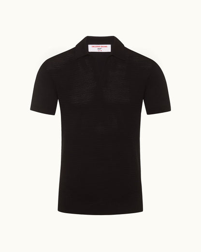 To learn about the intricate stitching in this black Horton polo shirt you'll need to cast your mind back to Sean Connery as 007 in 'Goldfinger' (1964). In one scene, he wears a dashing Moss stitch tie with a Glen Check suit. It's his first time debuting a knitted tie, so in celebration of the film's 60th anniversary, we've used it for inspiration. It's renamed 'Tie Stitch' in honour of the scene and film. The style is underscored by signature Horton features: an open resort placket, chic tailored fit and fully fashioned construction.