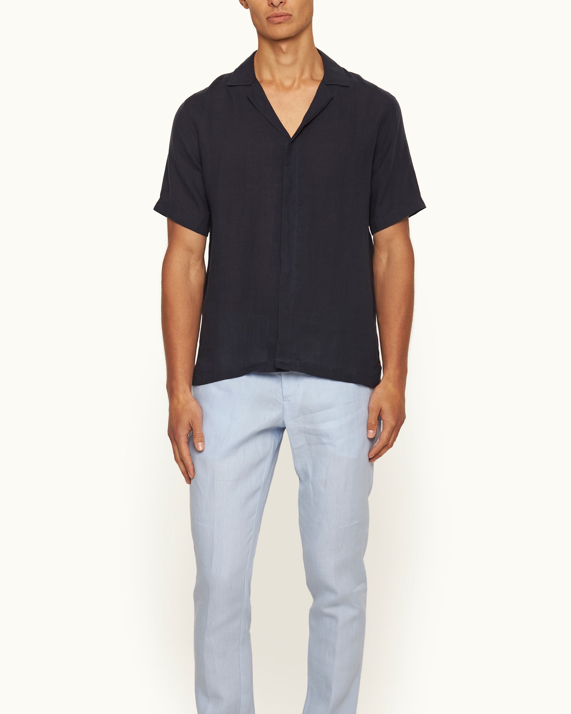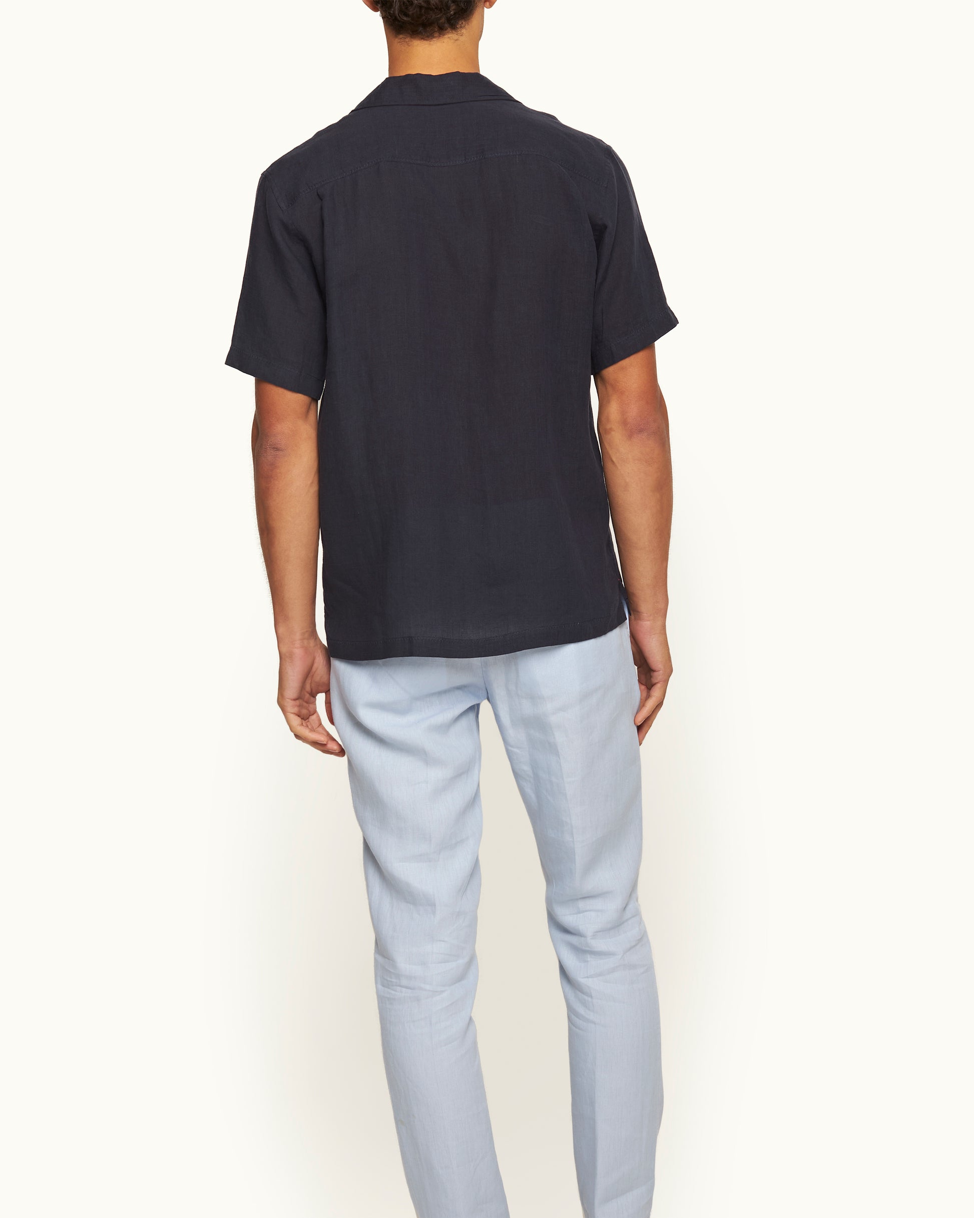 Our Night Iris Maitan shirt boasts Italian-woven linen to form a lightweight feel and carefree, vintage look. It also features a retro-inspired Capri collar, split hem, and a concealed button placket to underscore the clean lines of the shirt's silhouette. On the split hem, you'll find our subtle O.B stripe embroidery — our colourful signature touch.