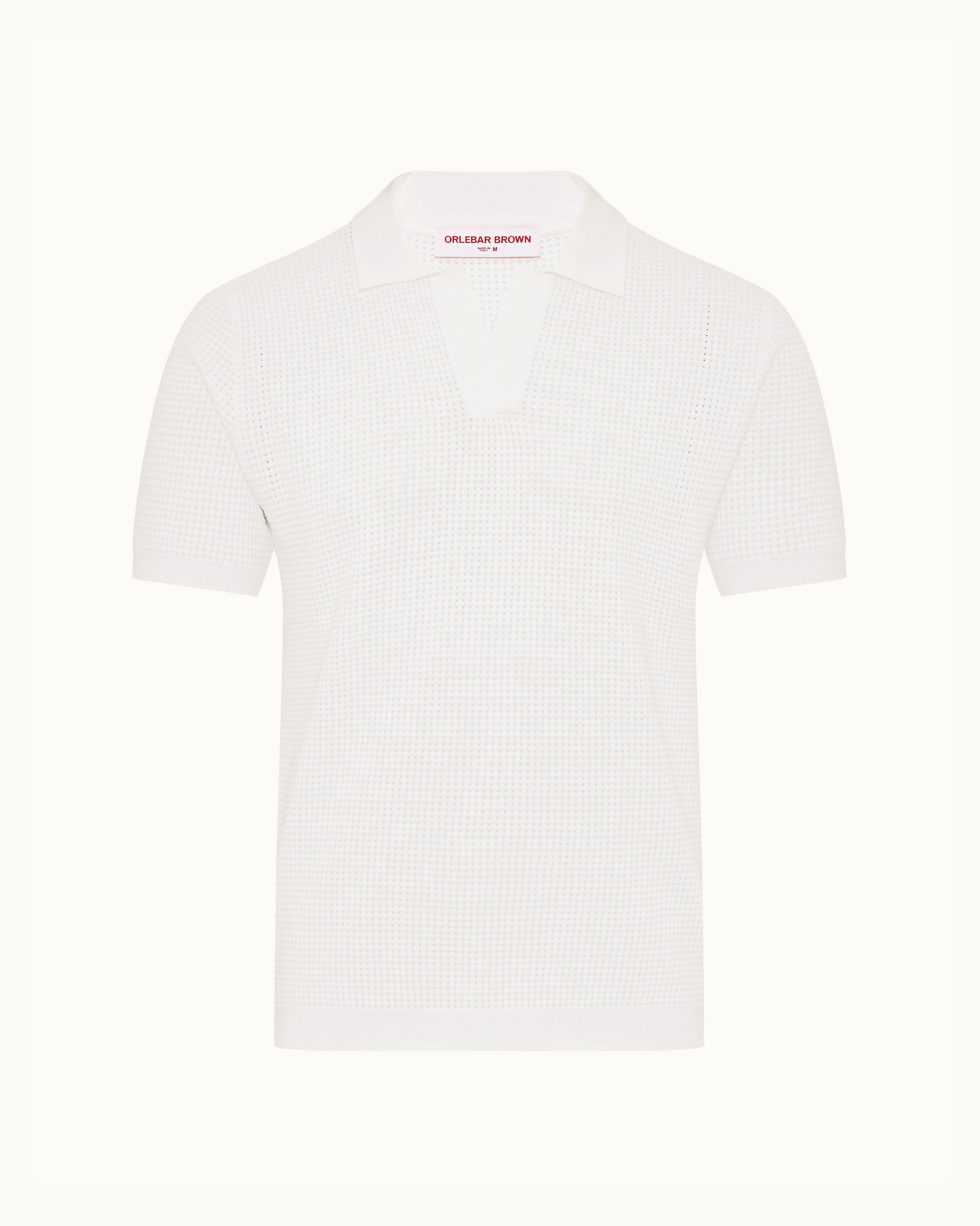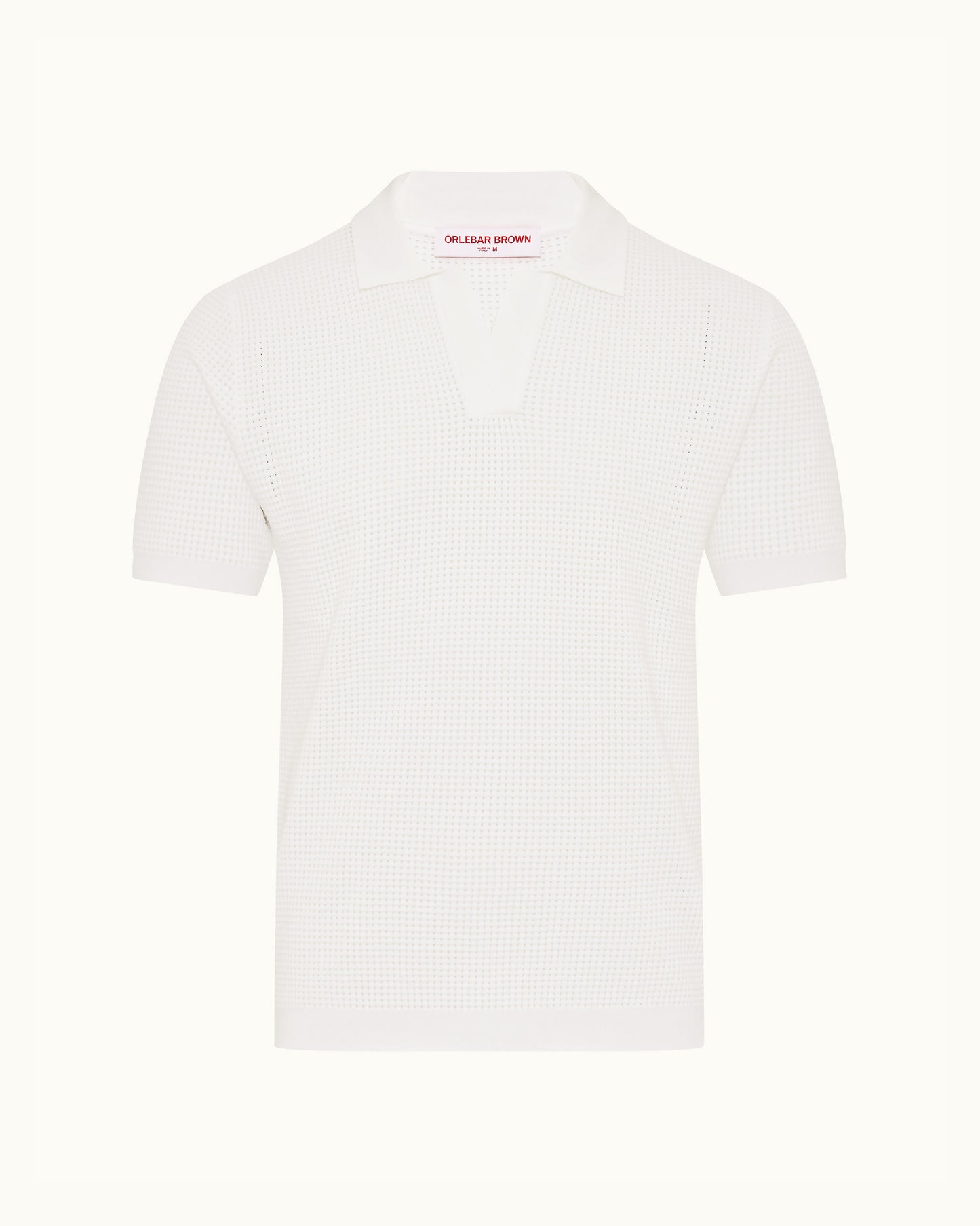 Laidback and sophisticated — that's our Roddy polo shirt. This white polo features a luxe Italian knit in a waffle mesh design, forming a flattering textured quality. The open resort placket comes in a fully fashioned ribbed knit, streamlining the design and enhancing quality.