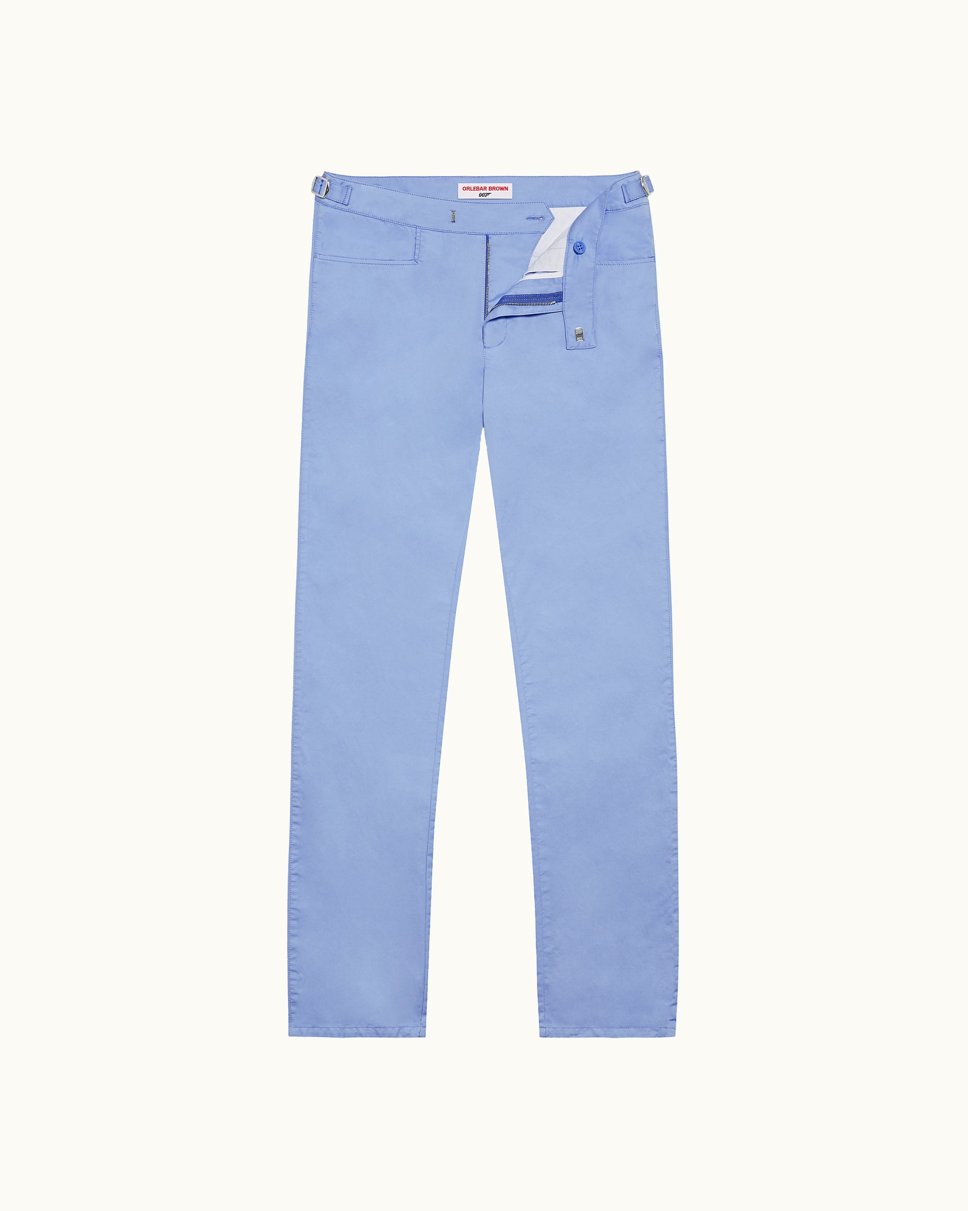 Cuando vayas a la playa, inspírate en el estilo de James Bond en la isla Crab Key, en la película Dr. No (1962), para darle la vuelta a los bajos de estos pantalones de algodón en azul Riviera. Después, ajusta el corte con nuestros distintivos cierres laterales.