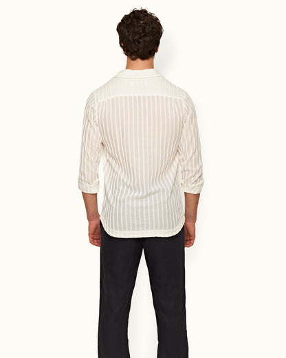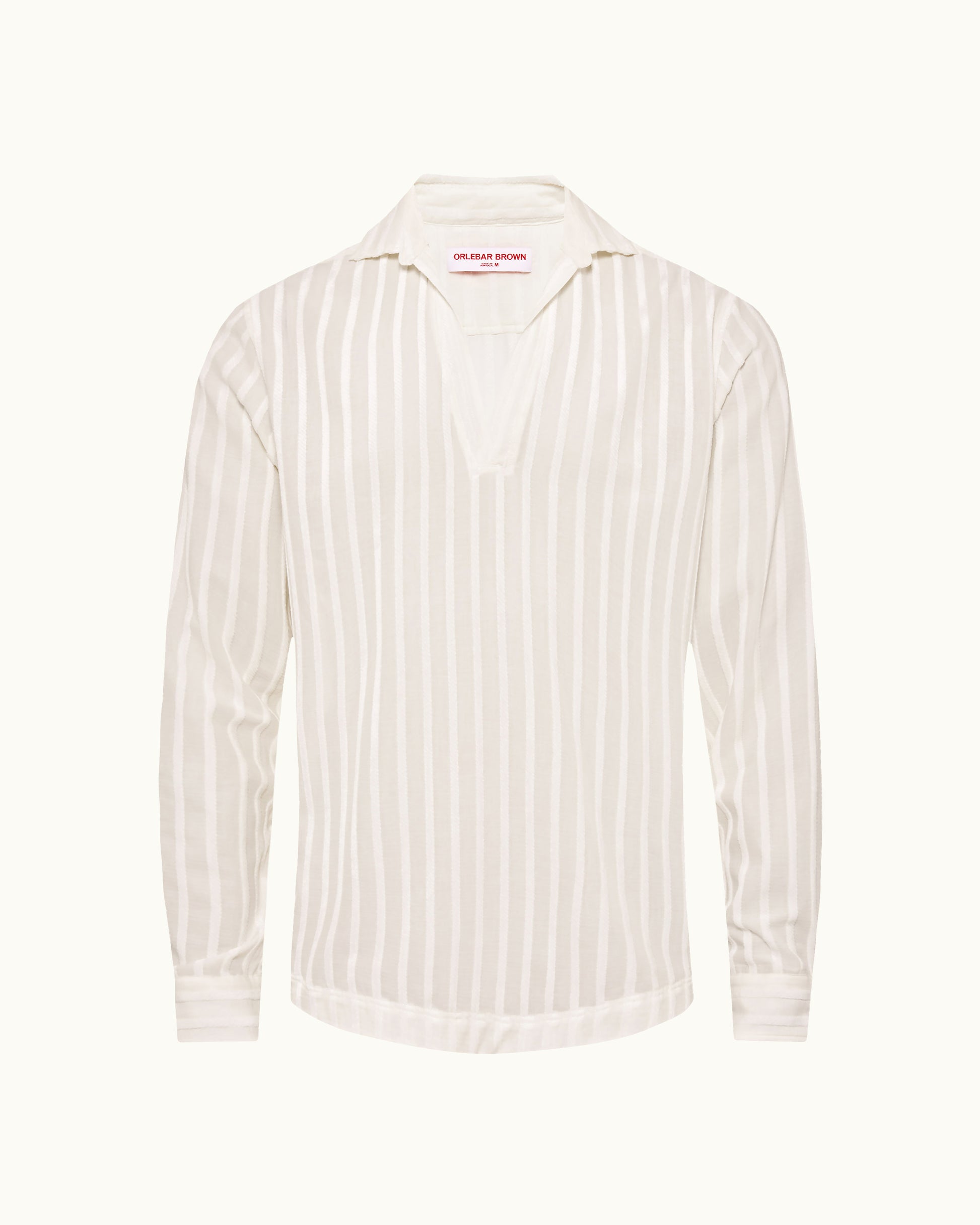 Esta camisa Ridley de manga larga tiene rayas de chenilla del mismo color con textura incorporadas en el diseño para conferirle un look de vacaciones atemporal. Es de una mezcla ligera y natural de viscosa, algodón y modal. El cuello clásico, la tapeta Resort abierta y la silueta informal son características distintivas de nuestro desenfadado modelo Ridley.