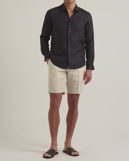 Le maître d’hôtel vous connaît déjà. Juste après l’olivier, la table est dressée pour deux. La lumière étale ses rayons dorés sur le calcaire. De l’autre côté de la place, quelqu’un joue un air doux et familier sur un piano droit usé par le temps. Vous passez votre commande simplement, avec confiance. Vous êtes l’homme inspiré par la Giles. En lin tissé en Italie. Nette là où il faut, adoucie par le soleil et le mouvement. Une coupe ajustée tout en sobriété. Un ourlet arrondi avec des surpiqûres et juste ce qu’il faut d’originalité. Assez élégante pour que l’on se retourne sur votre passage. Suffisamment confortable pour se faire oublier. Pas de vérification devant le miroir. C’est inutile. L’homme le mieux habillé de la pièce a rarement l’air de l’avoir fait exprès.