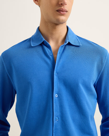 L’horizon s’étire, infini et ininterrompu. Le moteur ronronne sous vos pieds, stable et déterminé. Le brouillard du matin se dissipe alors que le premier rayon de soleil touche les embruns, la mer passe de l’argenté au bleu profond. Vous regardez rapidement derrière vous, les longs rivages noirs sont déjà loin et la terre s’efface. Qu’y a-t-il devant ? Peu importe. Avancer, c’est tout ce qui compte. La Giles Pique se meut de la même manière : piqué tissé en Italie, impeccable sans être guindé, avec un fini teint en plongée qui affiche la confiance tranquille des pièces bien portées et qui ont beaucoup voyagé. Ajustée mais jamais rigide. Une chemise pour l’homme qui sait oublier la carte routière.