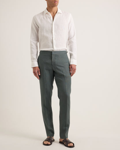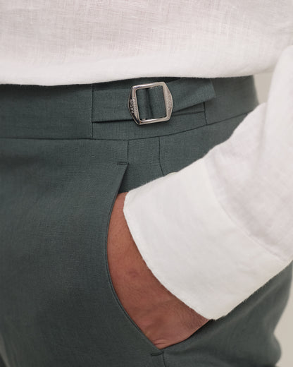 Le soleil de midi s’impose, lourd et doré. Les toits-terrasse en sont baignés - murs blanchis à la chaux, volets peints, lente ondulation du linge se gorgeant de chaleur. Une odeur de poisson grillé et d’herbes sauvages s’invite sur la place, portée par l’air et le faible murmure des voix en contrebas. Nul besoin de se presser, ni même de bouger, seul existe le plaisir tranquille d’être exactement là où vous êtes. Le Griffon a été conçu pour ce genre d’après-midi - Lin tissé en Italie, net mais sans contraintes, taillé avec juste ce qu’il faut de précision pour se sentir bien partout, tout naturellement. Le pli central et les boucles d’ajustement latérales assurent une tenue impeccable, mais qu’en est-il côté sensation ? Le confort à l’état pur. Un pantalon pour les hommes qui savent que parfois, le meilleur programme est celui qui n’existe pas.