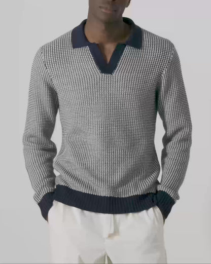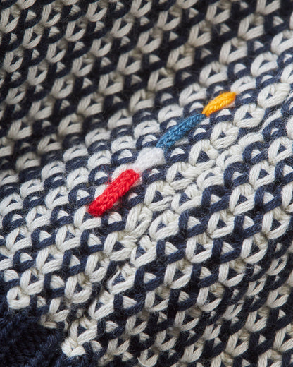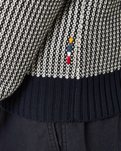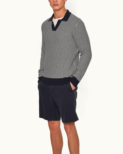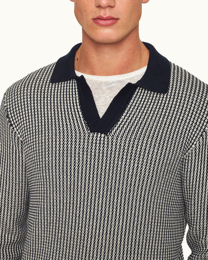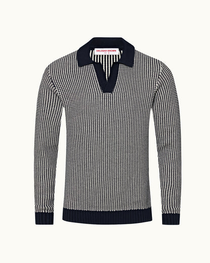 Notre polo Horton bleu marine et blanc fait la part belle aux textures. Visuellement attrayante et tactilement texturée, la maille bicolore saisissante est fabriquée en coton bio ultra doux. Côté finitions, ce polo à manches longues affiche des bords-côtes bleu marine unis au col, au poignet et à l’ourlet.