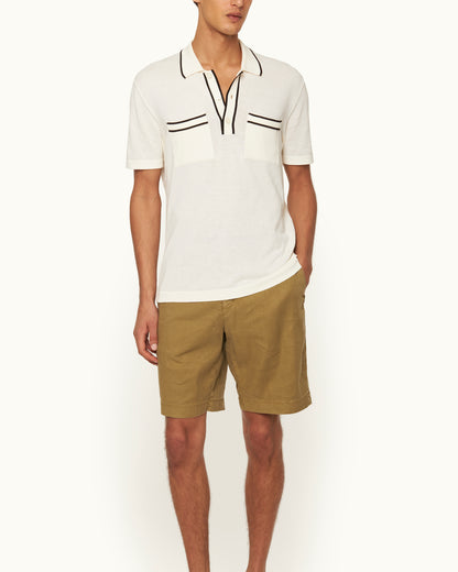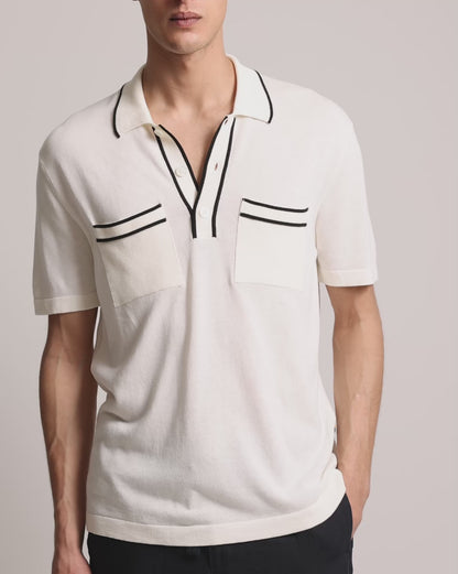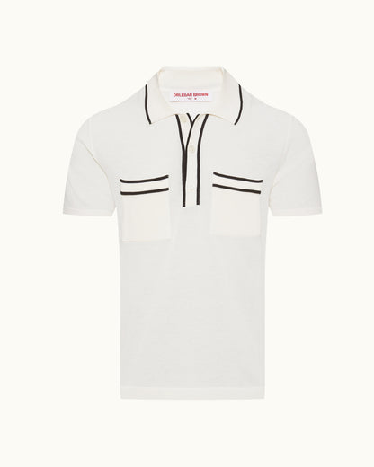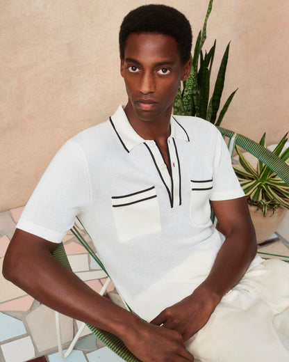 Nous avons joué la carte de la créativité avec ce polo Keeling blanc. Le liseré noir au niveau du col, de la patte et des deux poches poitrine confère à ce modèle un aspect rétro original. Douce et somptueuse, la maille italienne luxueuse en mélange de coton bio et de soie en fait une pièce incroyablement confortable. Enfin, le design entièrement façonné signe une qualité irréprochable.