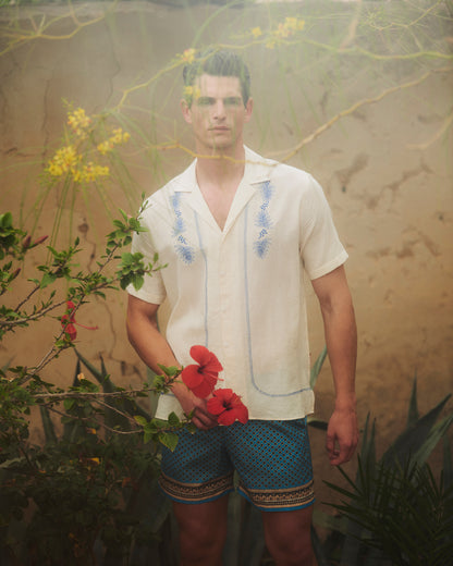 Nous avons utilisé du coton italien tissé pour concevoir cette chemise Maitan blanche flatteuse, qui offre une sensation de légèreté et de respirabilité. Ce modèle à manches courtes affiche un col Capri d’inspiration rétro, une fente sur l’ourlet et une patte de boutonnage dissimulée qui créent la silhouette sobre caractéristique de la Maitan. Mais bien sûr, le détail le plus remarquable est la broderie bleue d’inspiration grecque le long de la patte de boutonnage et de l’ourlet.
