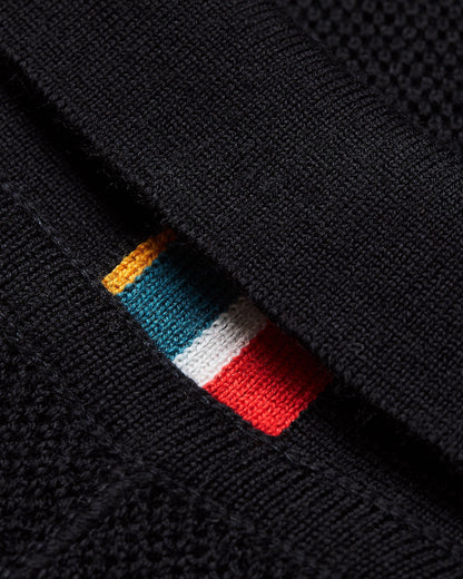 • Bande à rayures OB tricotée sous le col au niveau du dos