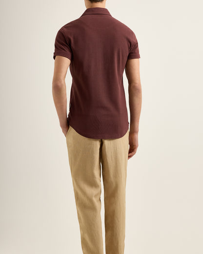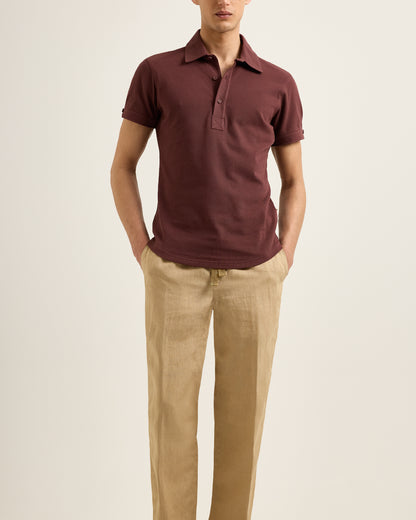 Le déjeuner déborde sur l’après-midi, comme il se doit. Une table en bord de mer, du sable chaud sous les pieds, l’odeur du poisson grillé tourbillonnant dans la brise. Quelqu’un lève la main pour commander une autre bouteille, le seau à glace se couvre de gouttes d’eau au soleil. L’après-midi s’écoule nonchalamment sous la lumière dorée. C’est pour cela qu’a été conçu le polo Sebastian. Ajusté mais léger, en lin aérien, avec une patte profonde à trois boutons juste assez ouverte. Certains polos sont décontractés. Celui-ci a le sens de l’élégance. Une légère brise soulève la serviette de table. Le serveur sait déjà tout. C’est ainsi que commence la meilleure des journées. Et ainsi qu’elle s’allonge à l’infini.