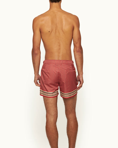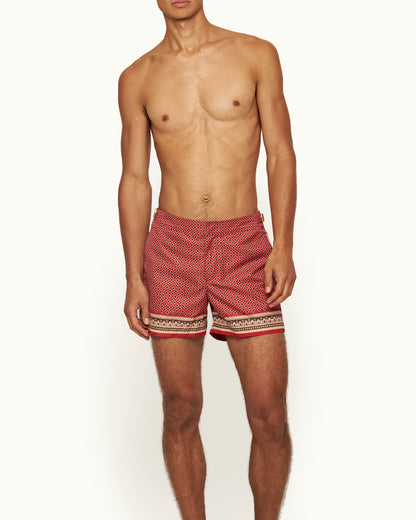 Orné de notre imprimé Solmio rouge vif, ce short de bain Setter se démarque de la plus belle des manières. Le motif floral géométrique est sublimé par un ourlet à rayures cachemire et des boucles d’ajustement latérales en métal doré. Le tissu léger à séchage rapide assure votre confort lorsque l’appel de la piscine se fait entendre.