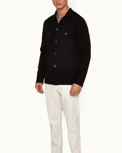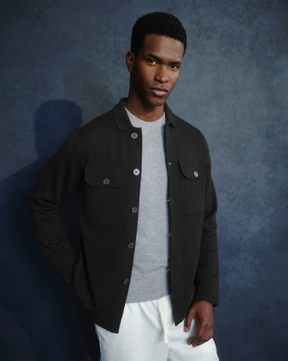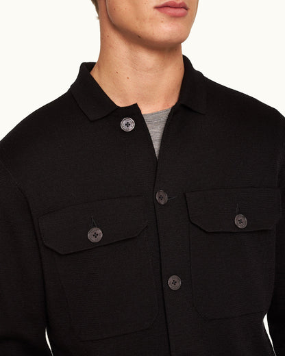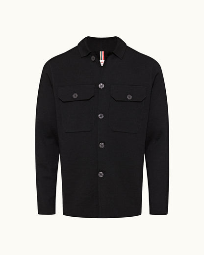 Find the perfect balance between smart and laidback with the Brigg overshirt. This black layering piece boasts a sumptuous Italian knit with super-fine Milano stitching for a denser, neater feel. The classic collar, branded buttons, and patch pockets instil classic features.