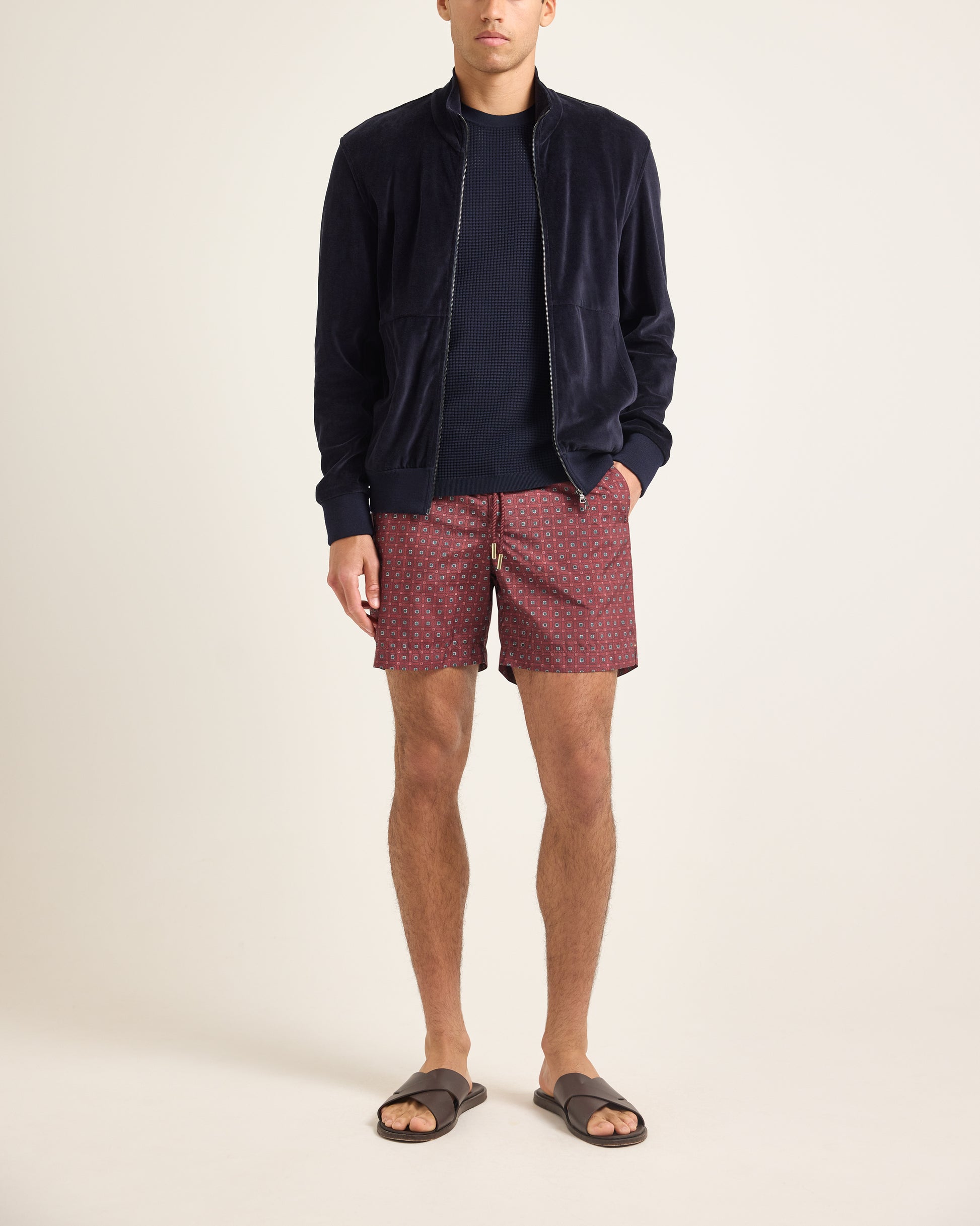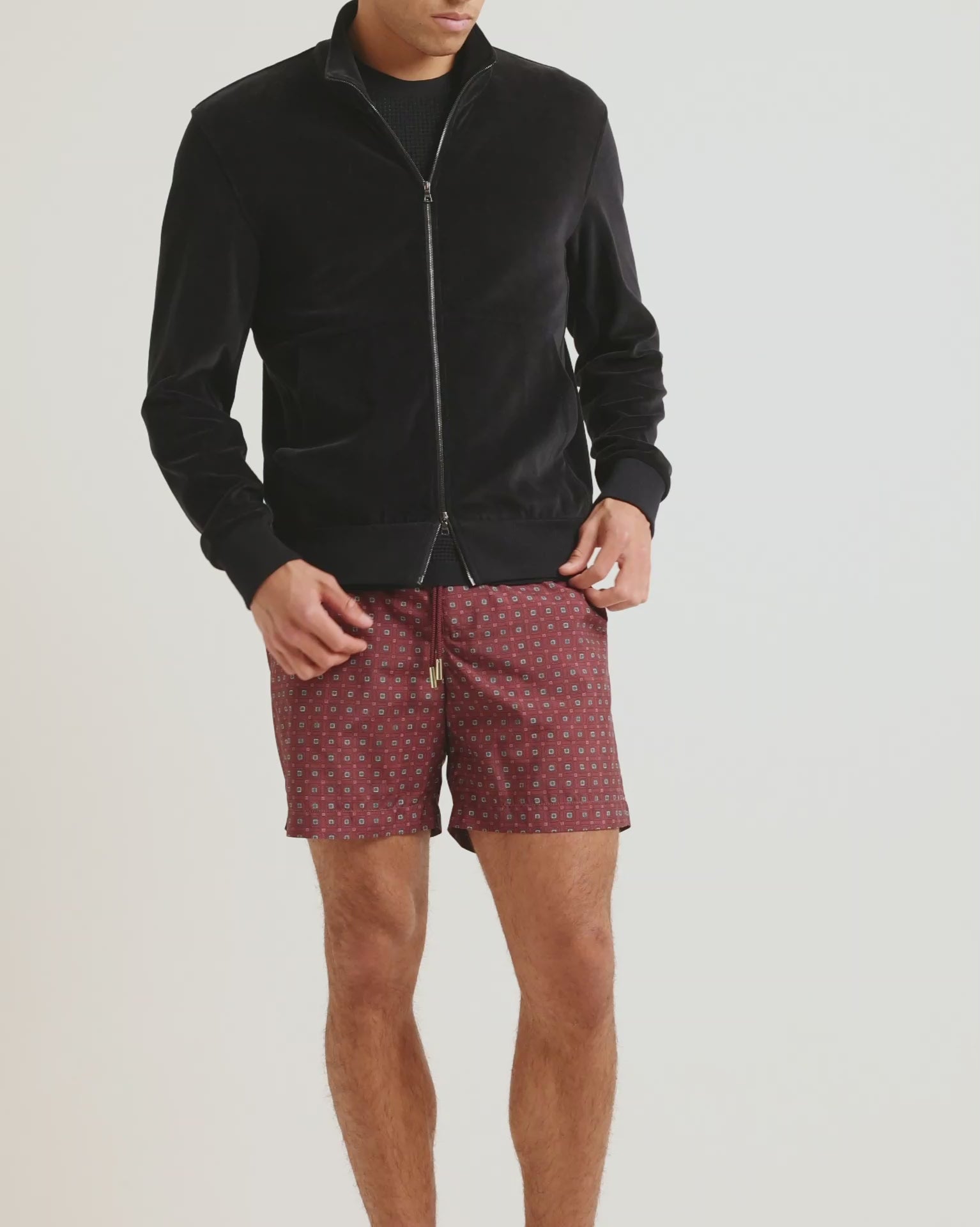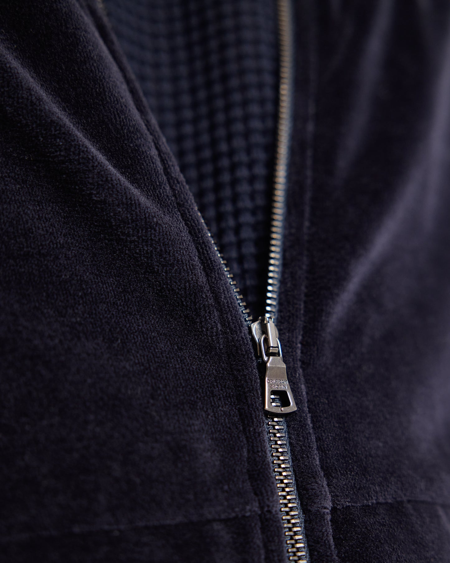 Cassian was made for that golden hour after dinner—when the plates have been cleared, the wine lingers, and the cobbled lanes of a Puglian village beckon with the promise of mischief or maybe just more gelato. Cut in a classic fit with a zip-through funnel neck, it’s rendered in Italian stretch velour - 85% cotton, 15% polyamide, all charm. There’s something quietly decadent about the way it catches the light, like moonlight on old stone or espresso crema in a crystal demitasse.