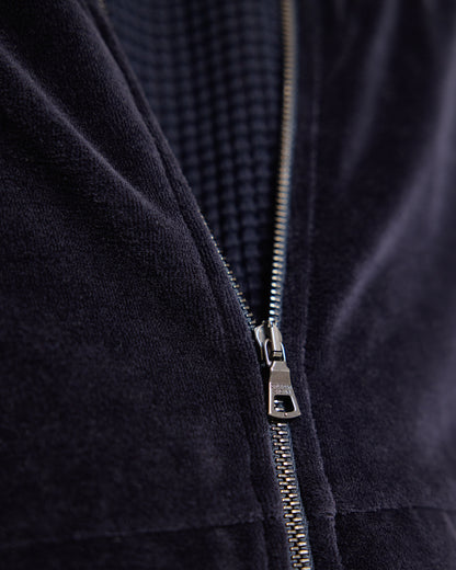 The black oxidised zip with gunmetal puller keeps things grounded, while the merino rib cuffs and hem offer both contrast and comfort - like slipping on a midnight secret. Front pockets await your hands, a room key, or the last biscotti from dinner.