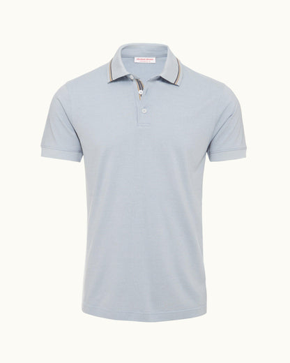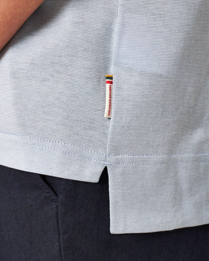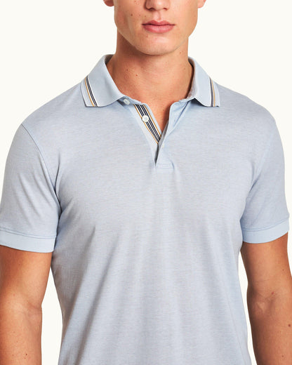 This Dominic polo shirt combines classic tailoring with a signature O.B finish — contrast seasonal stripe tipping along the collar and the inner placket. This light blue short-sleeved polo keeps it simple with a three-button placket, classic fit, and breathable jersey fabric for all-day comfort.