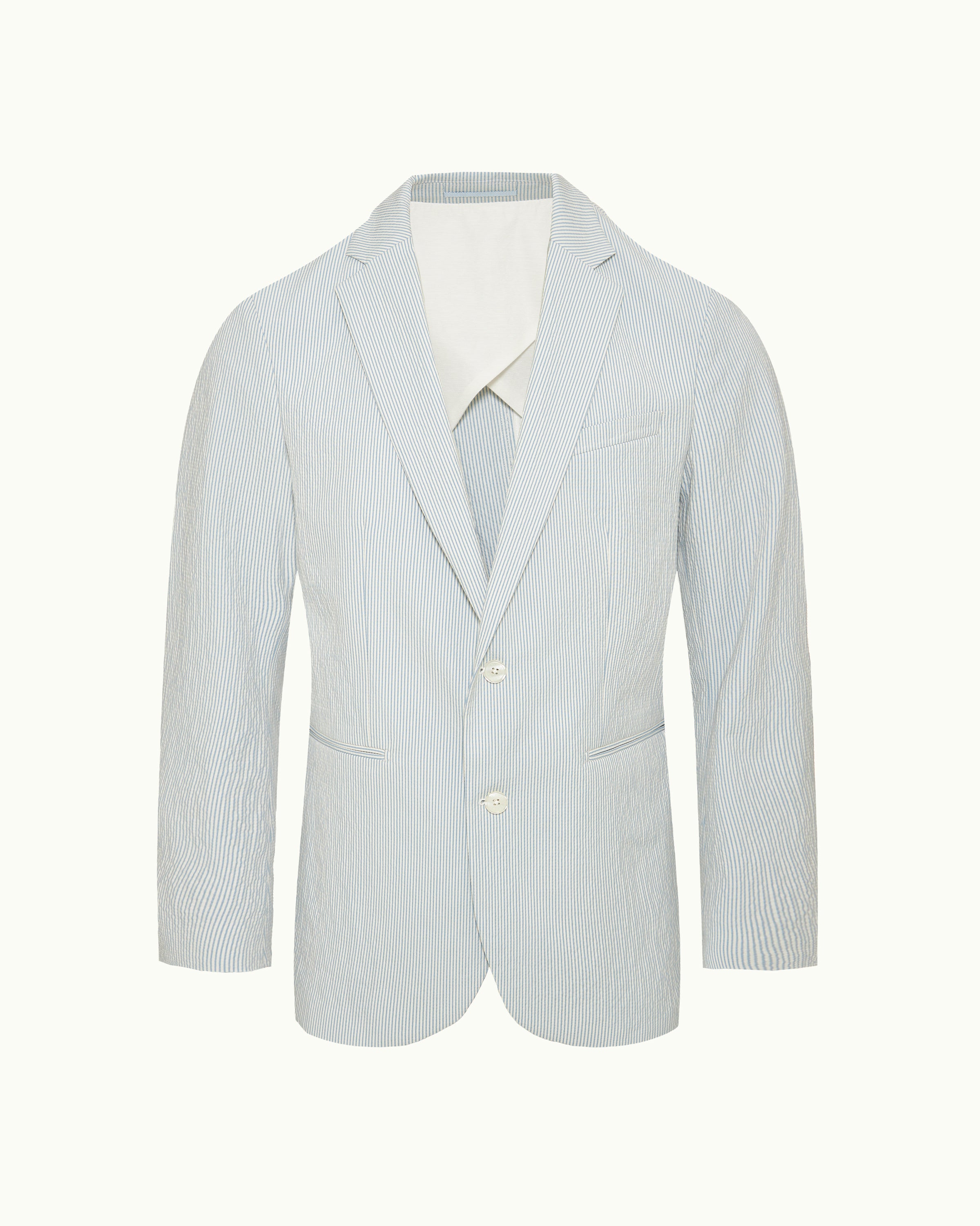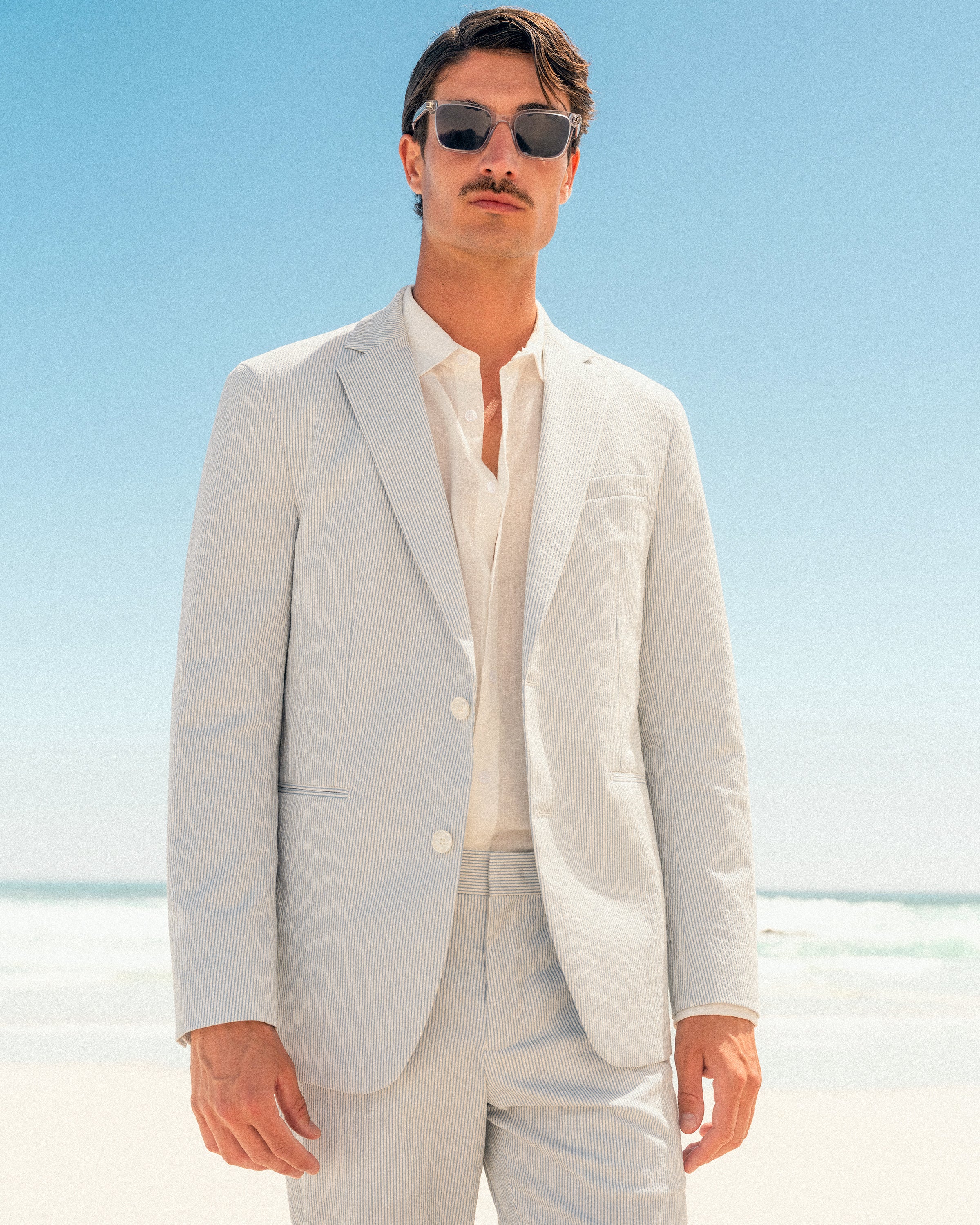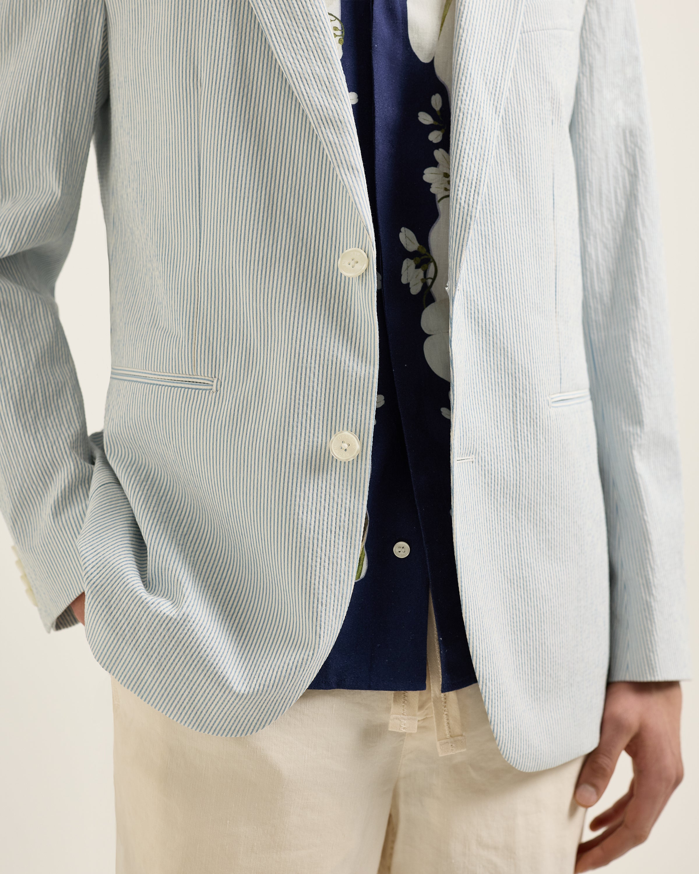 Just over the next dune the beach bar-b-que beckons, a curling plume of gentle smoke rises. The aroma of grilled shellfish—briny, buttery, and just a little bit wicked, dances on the soft wind. The tang of sizzling citrus and salt-laden breeze unite to sing a lullaby of hedonistic promise. The Garret seersucker blazer doesn’t demand attention - it owns it. Soft as a whispered secret, tailored to move with you rather than against you. A soft shoulder, barely structured, an easy drape, confidence stitched into every thread. It belongs to days that never follow an itinerary.