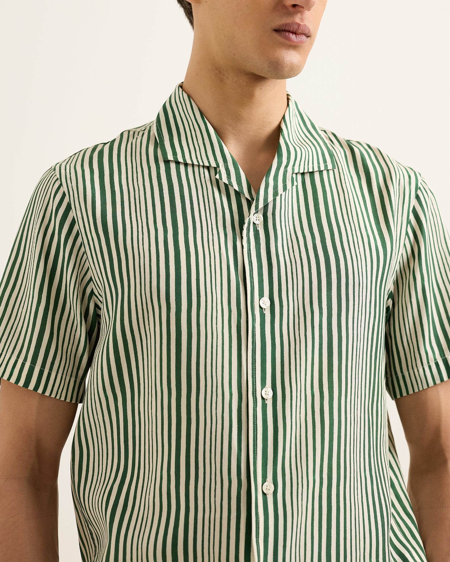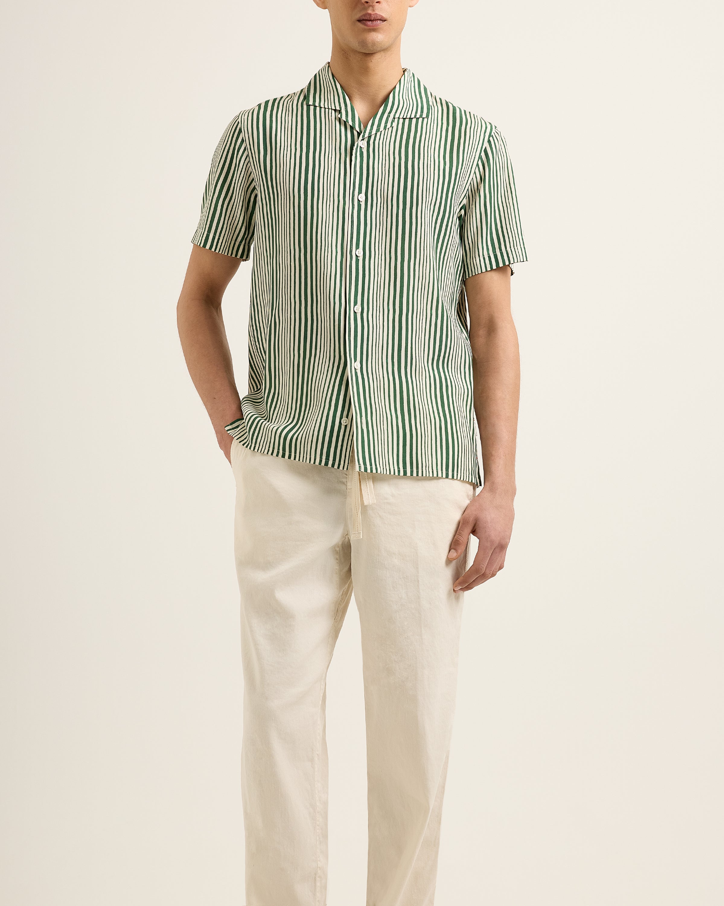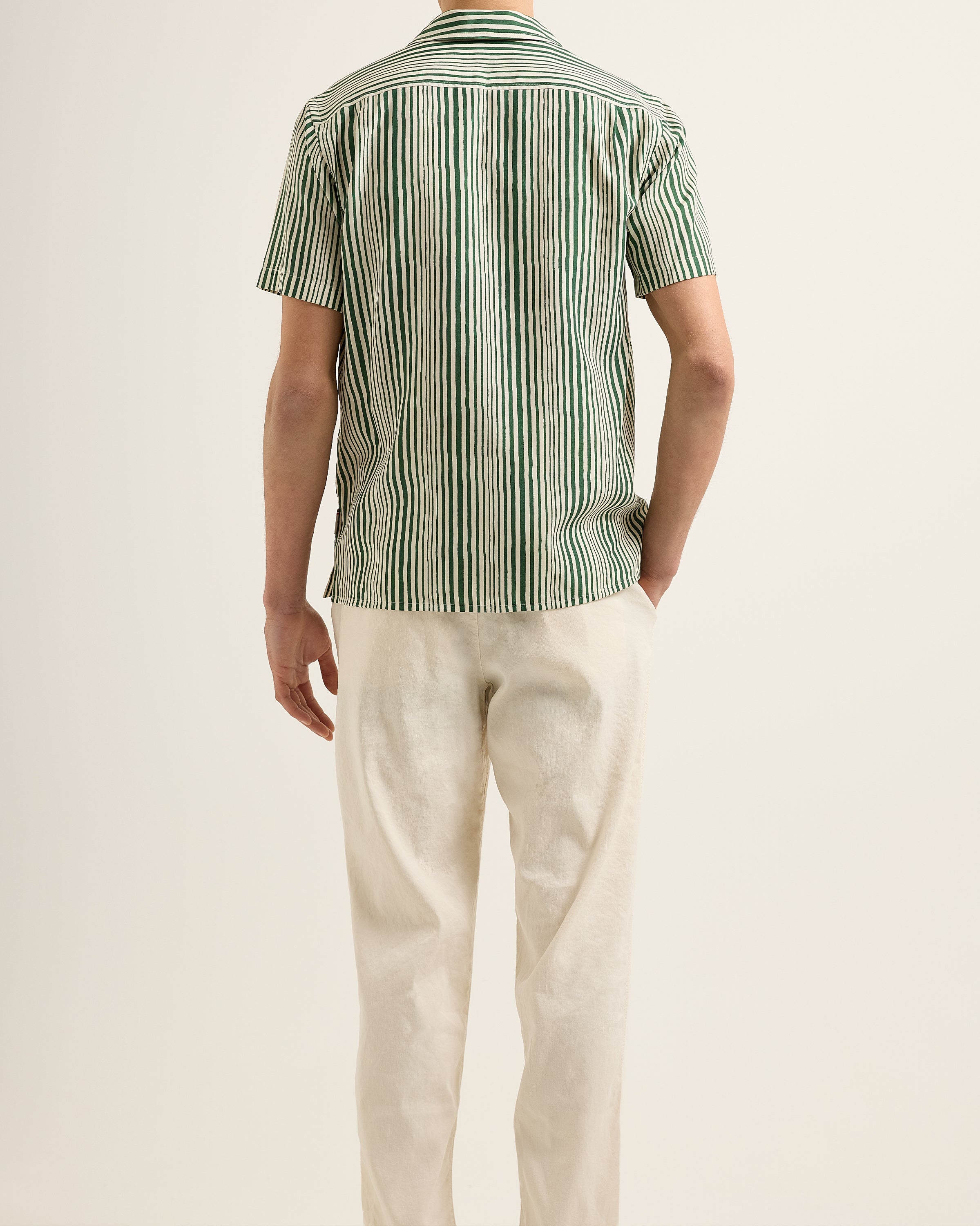 The Hibbert moves as easily as discovery. Super-light linen, striped like the tide, shifting with the breeze as you walk inland, past olive groves long forgotten. The Capri collar sits open, the cut designed for nothing but ease. A shirt made for places like this - where no plan is the only plan. A distant crash of waves. The crackle of a radio left playing somewhere inland. You weren’t supposed to find this place. But now you’re here.