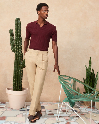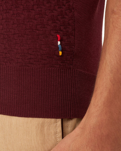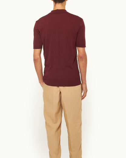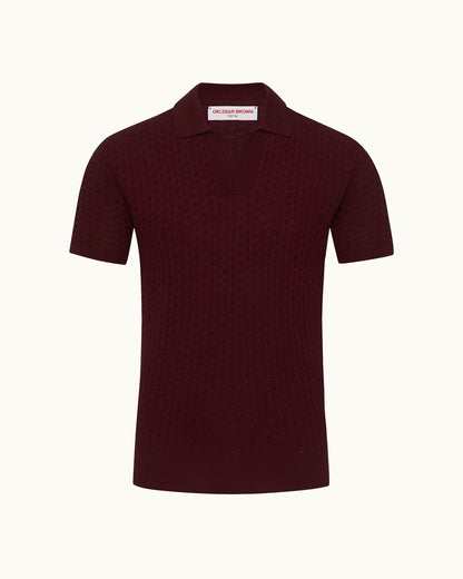 Exude laidback elegance with the Horton, our signature knitted polo shirt. The luxe Italian knit blends silk with organic cotton in an attractive lattice design, giving visual depth and impeccable quality. The signature open resort placket adds to the relaxed aesthetic. Finally, the deep Damson Red colourway finishes the design on a sophisticated note.