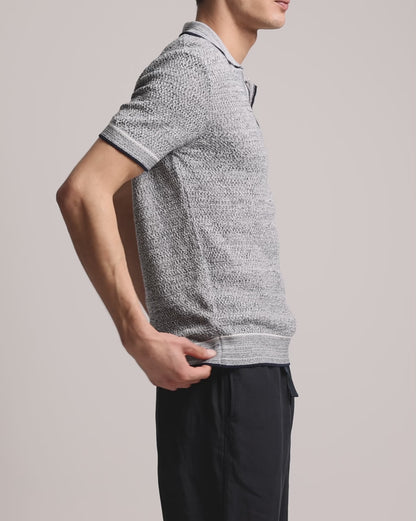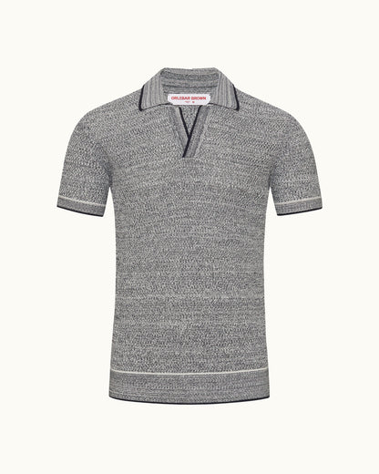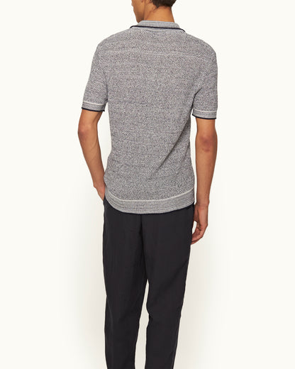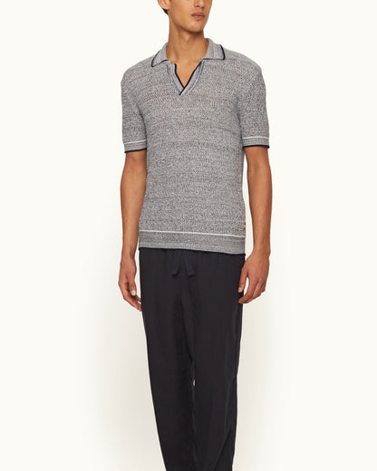 Our navy Horton polo shirt is a refined knitted style with unexpected details. This short-sleeved polo boasts a 12-gauge Italian knit made from pure cotton, forming a soft, lightweight feel. The striking melange finish creates a textured look, while white striped tipping adds a bold contrast. It's finished with an open resort placket, a signature of our Horton polo.