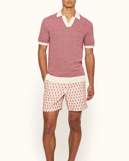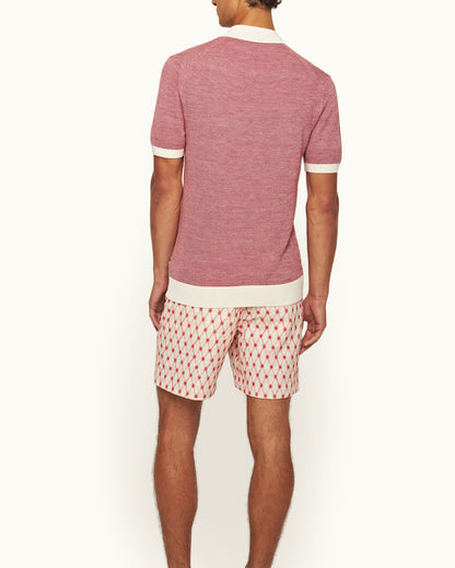 Our Horton polo shirt is all about bold lines and luxurious textures. The Italian cotton and merino yarn twists to form a soft, textured feel, while the white ribbed detailing elevates the mottled red base. Our trusted tailored fit and fully fashioned seams give you a natural, comfortable fit.