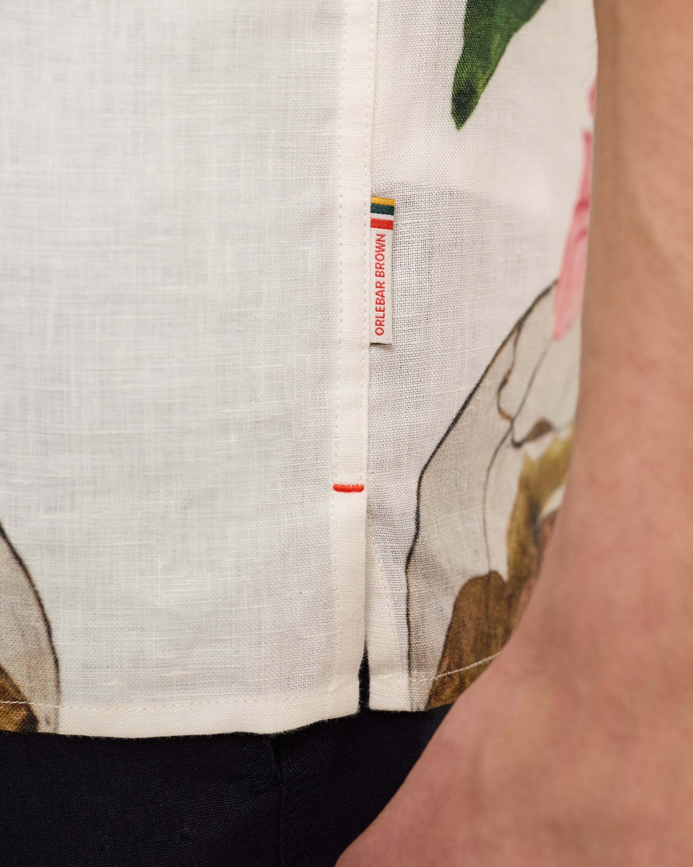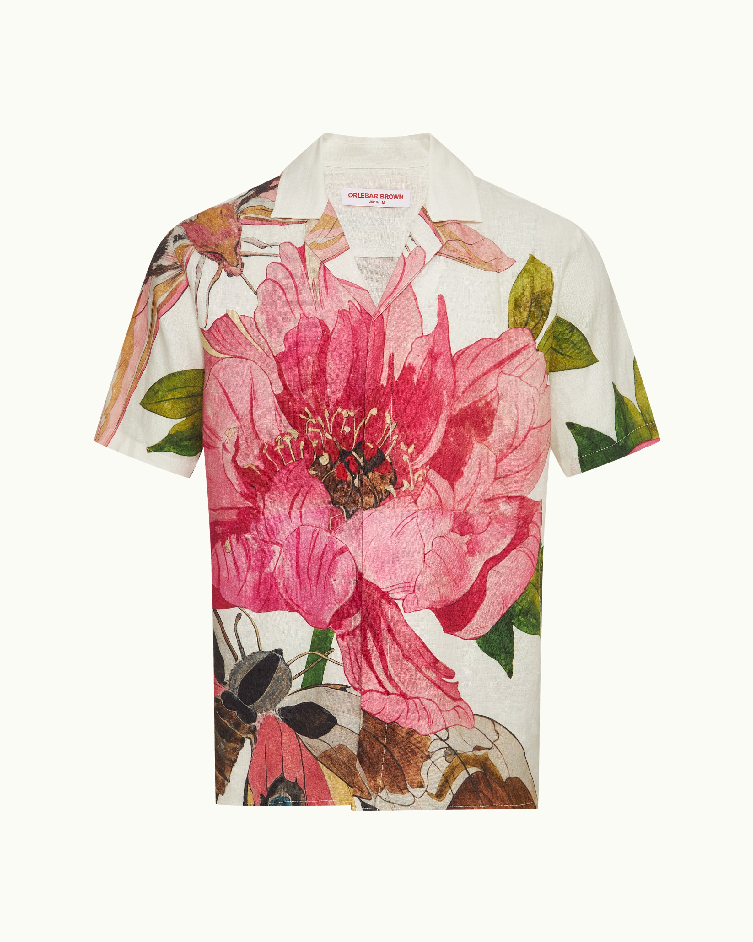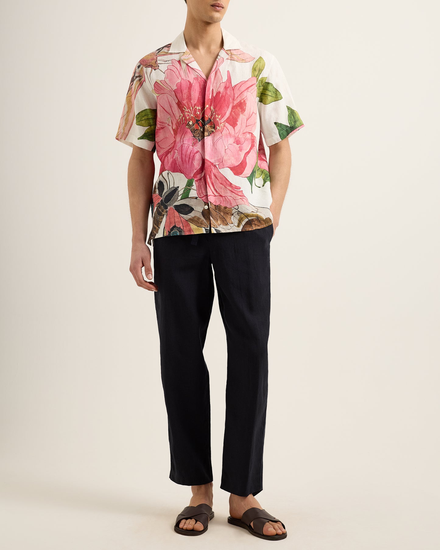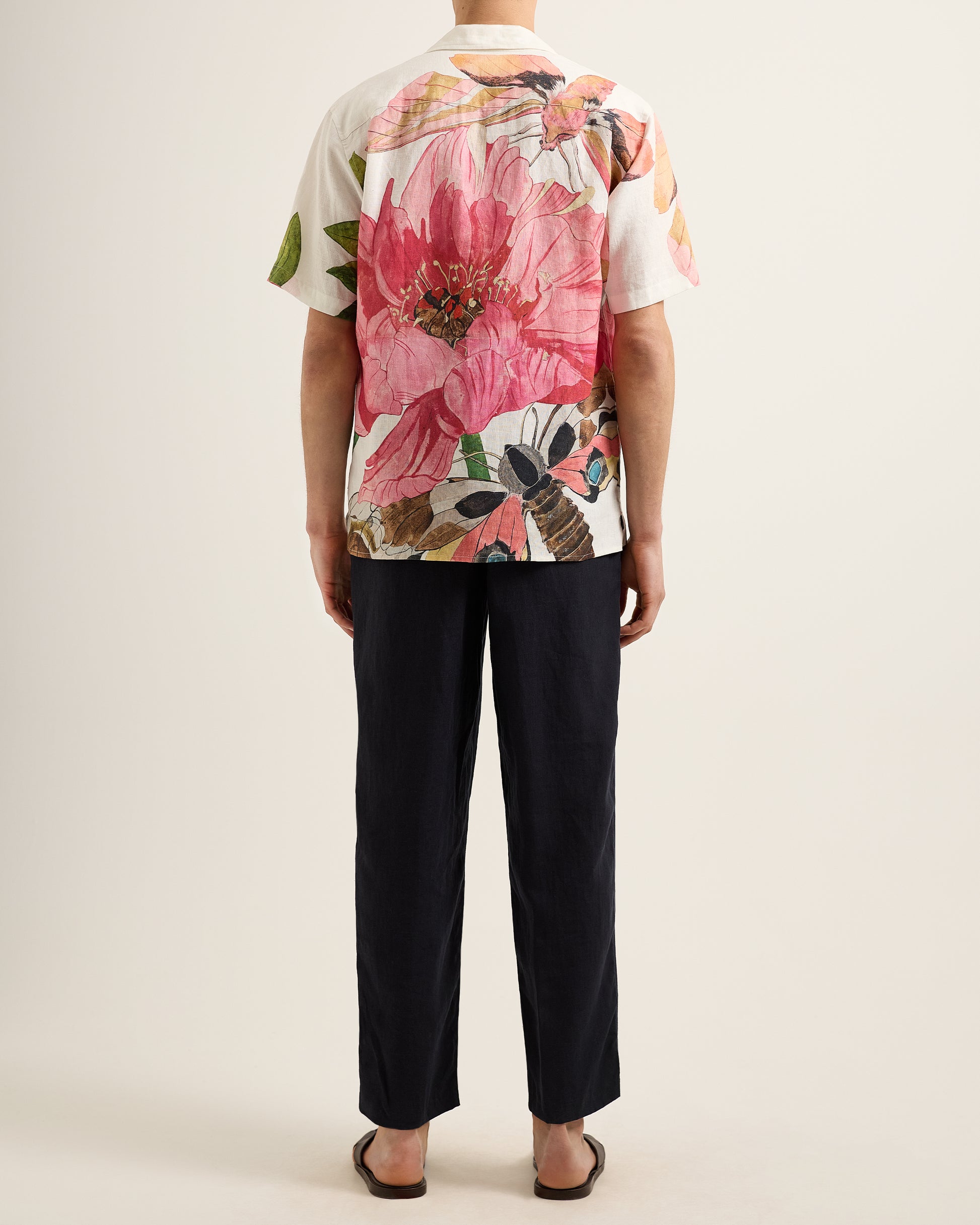 He taps the arm of his lounge chair, fingers drumming the improvised melody of a soul finally released from daily cares. The Maitan moves with effortless ease - lightweight, woven with the bold sweep of the Paeonia print, a hint of playfulness beneath clean precision. The Capri collar rests just open enough, the concealed placket keeping its refinement intact. A shirt made for slipping between worlds, for moments that feel like déjà vu.