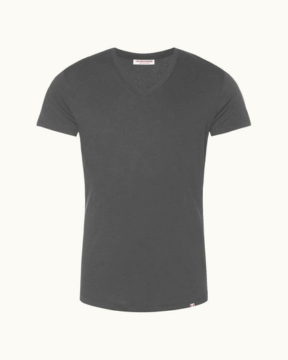 The OB-V in Storm Grey is our original v neck tee. Made with supersoft lightweight fabric, a tailored silhouette and curved hem, 100% pima cotton, it has a luxurious feel and superb fit, making it one of our most popular T-shirts.