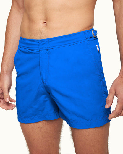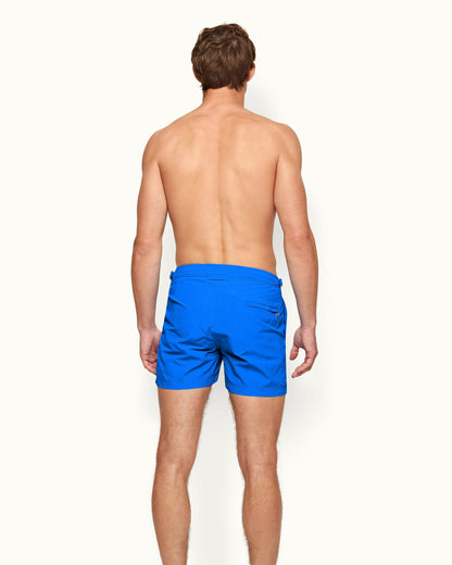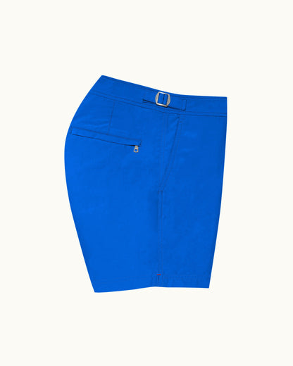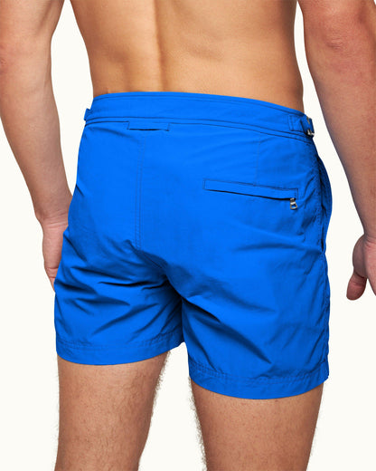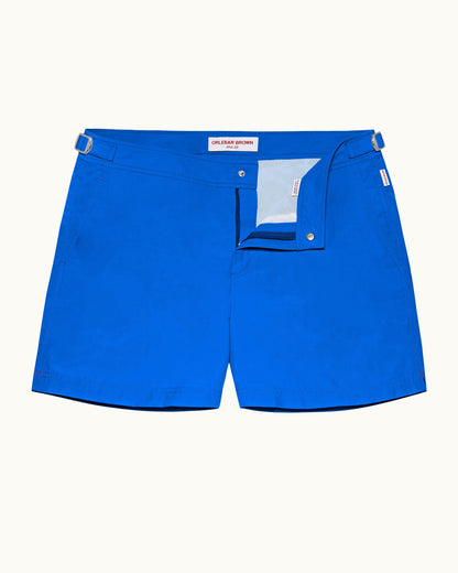 The OB Classic Setter in Nova Blue is based on the pattern of a traditional man’s suit trouser – it's not a swim short, but a short you can swim in. The shorter length swim shorts have a perfect fit and signature side-fasteners. With over sixty elements in each pair, OB Classic swim shorts are made from 100% recycled plastic.